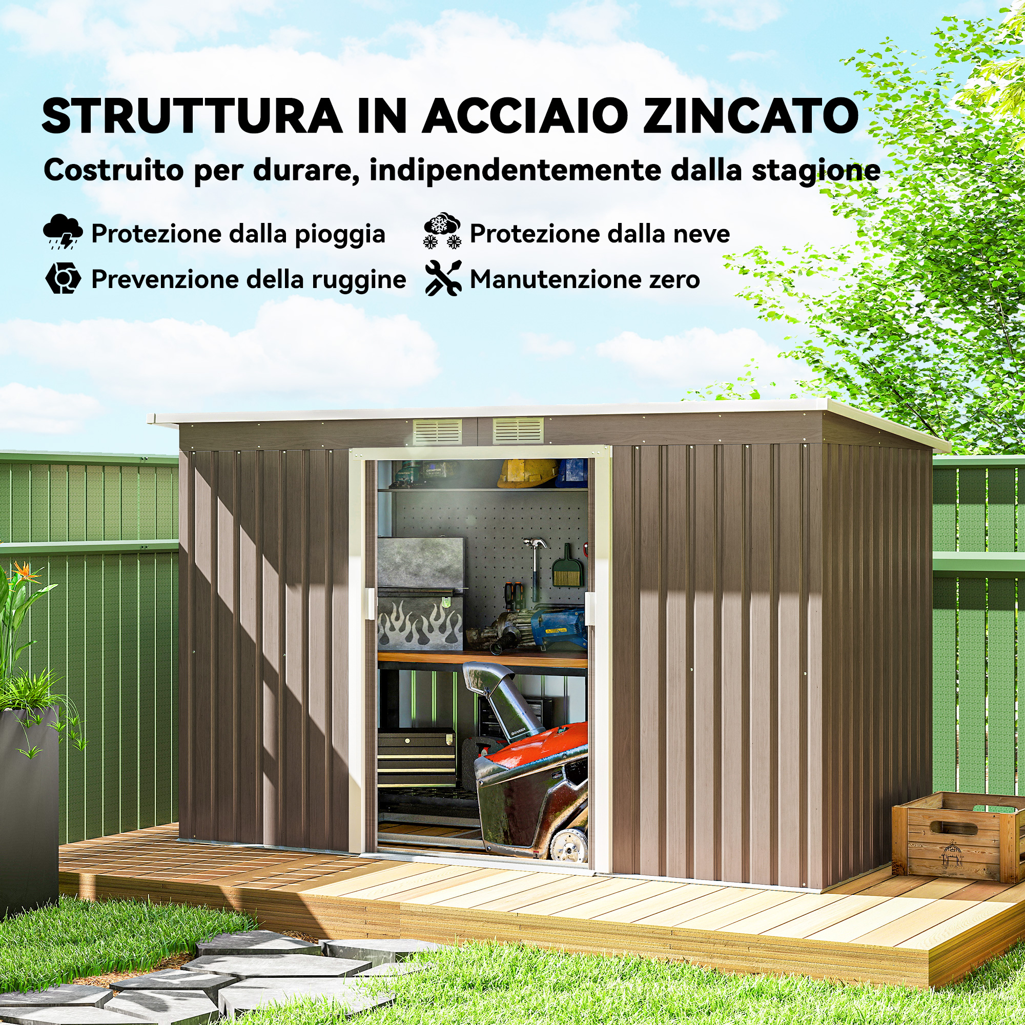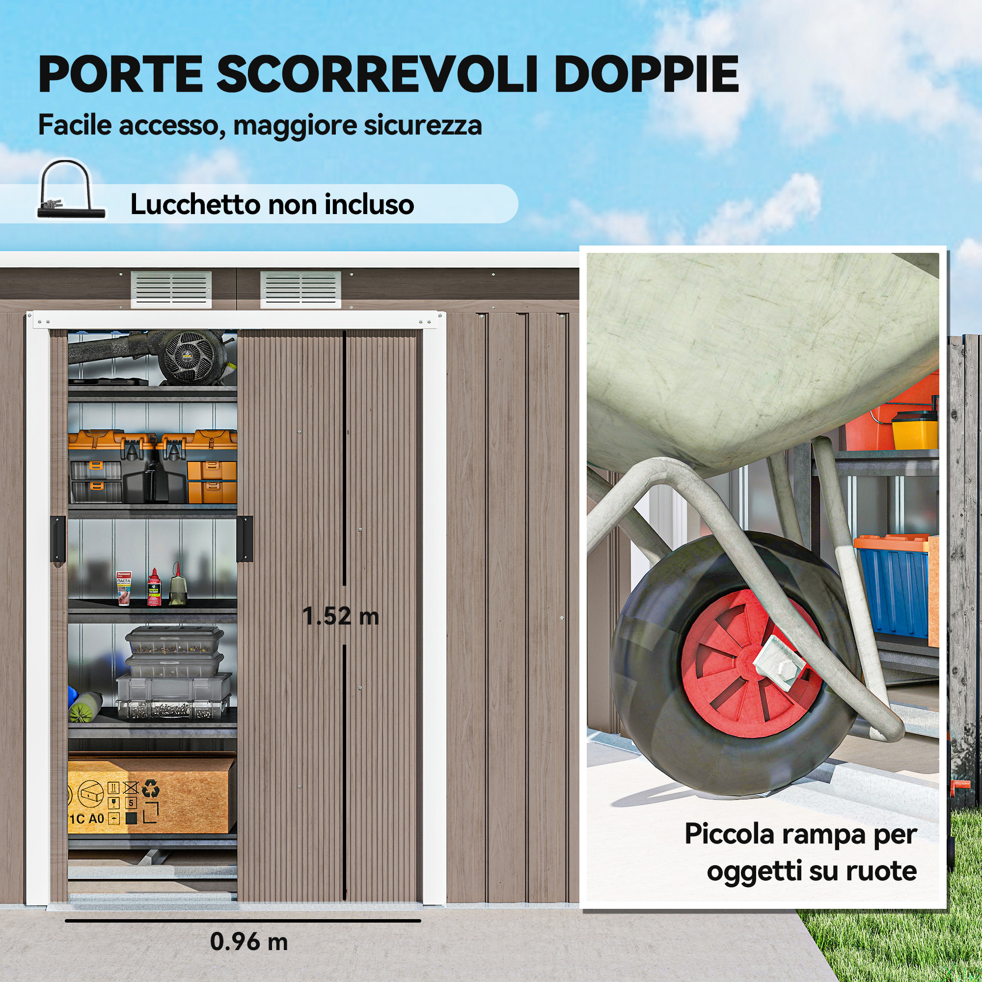 Ripostiglio da Giardino in Acciaio con 2 Prese d’Aria e 2 Porte Scorrevoli, 280x130x172 cm, Marrone Legno