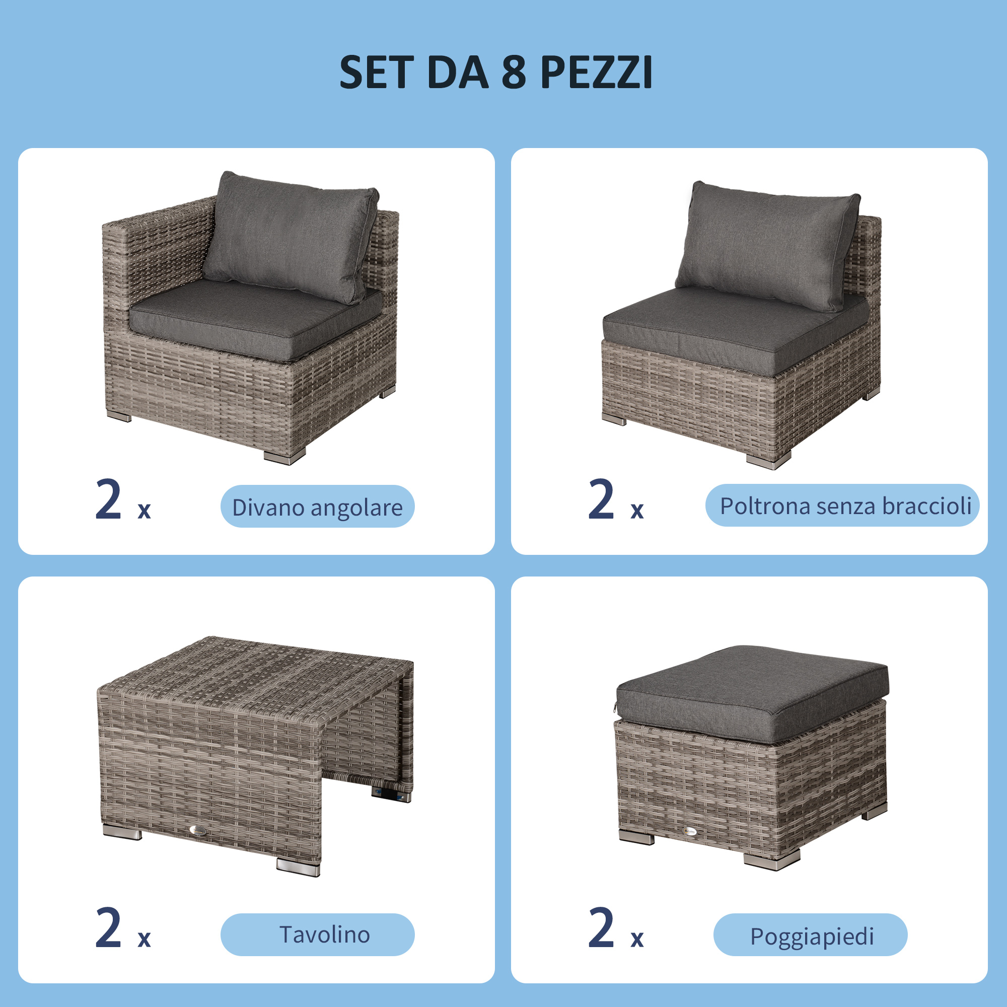 - • Set da 8 pezzi, include 2 poltrone ad angolo, 2 poltrone singole, 2 pouf e 2 tavolini