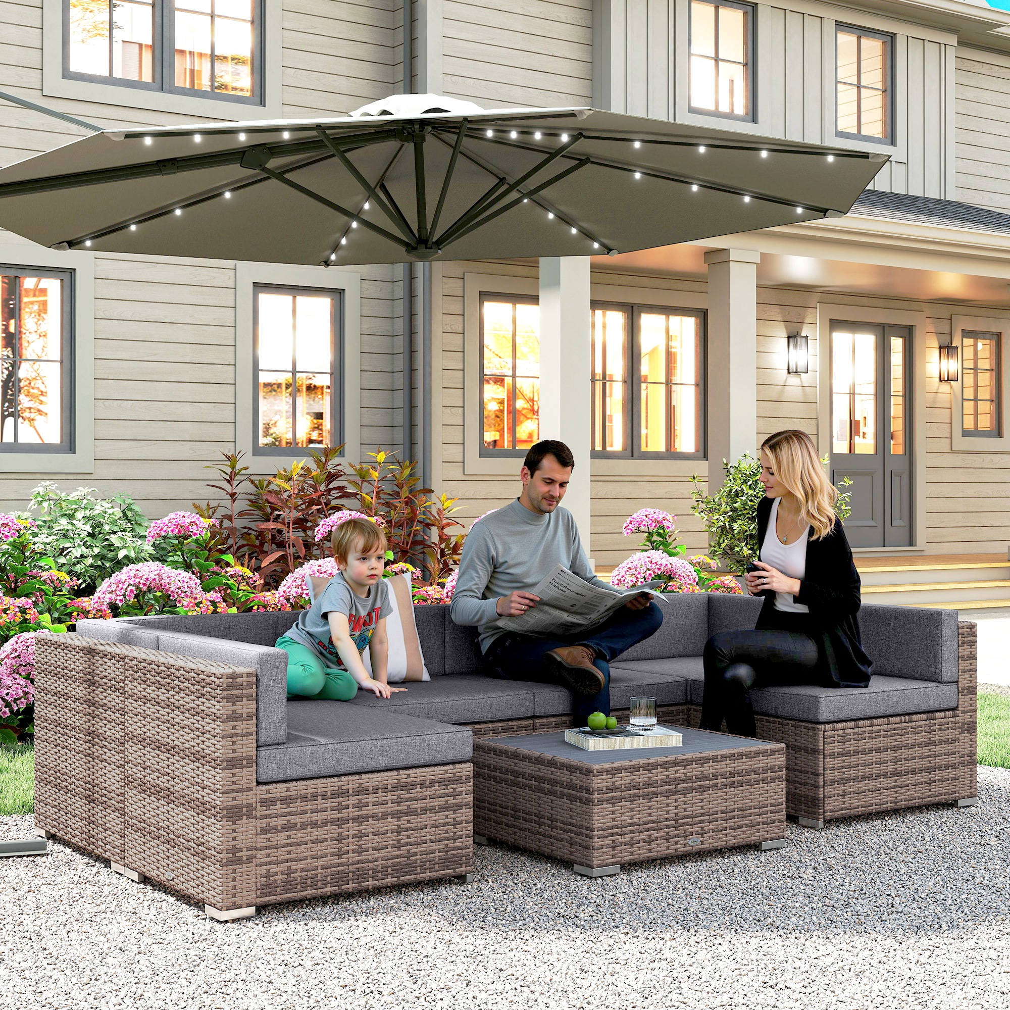 Salotto da Giardino in Rattan da 7 Pezzi con Tavolino e Divano Modulabile con Cuscini, Grigio