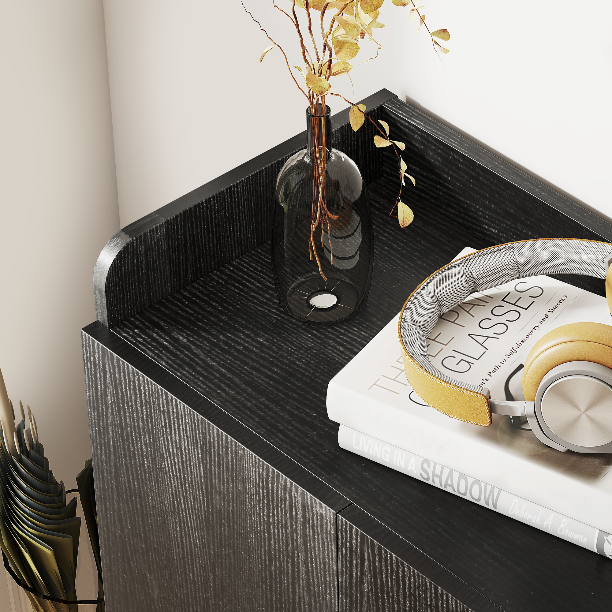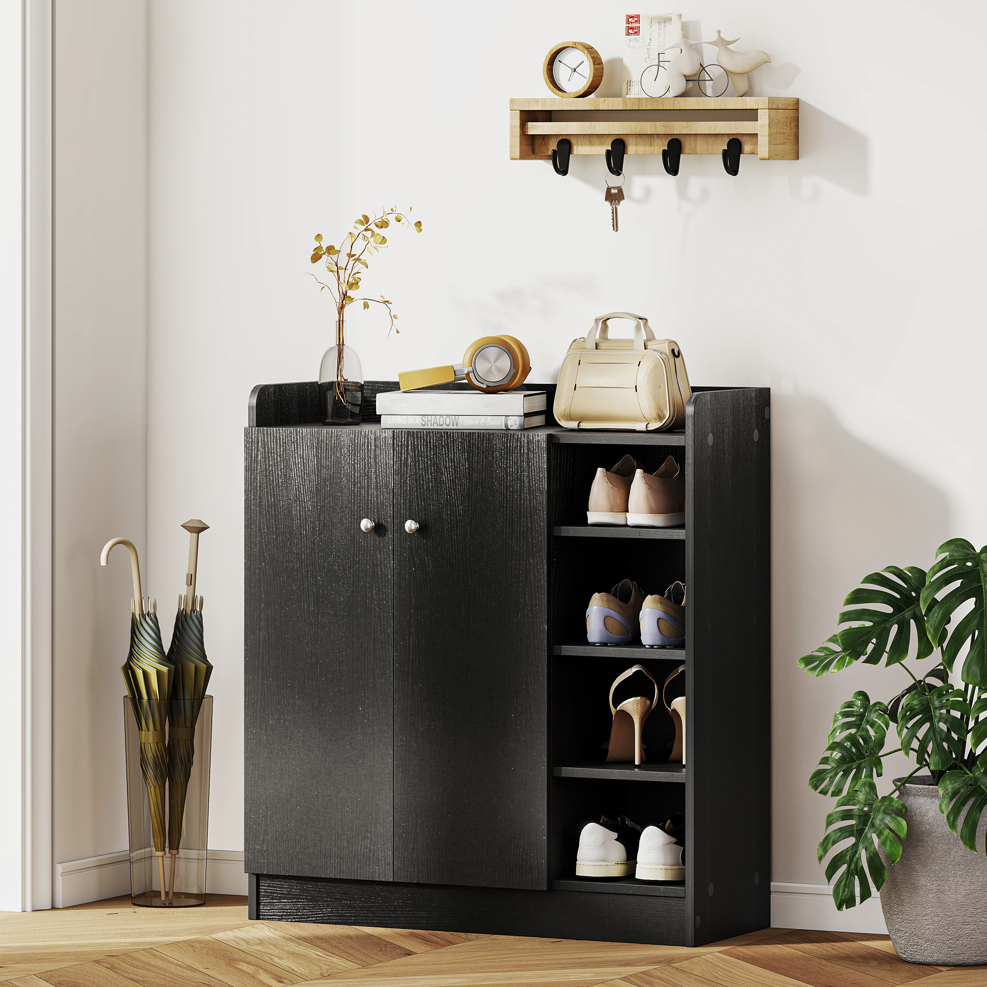 • • Scarpiera da ingresso con 4 ripiani aperti e armadietto a 2 ante con pomelli in metallo