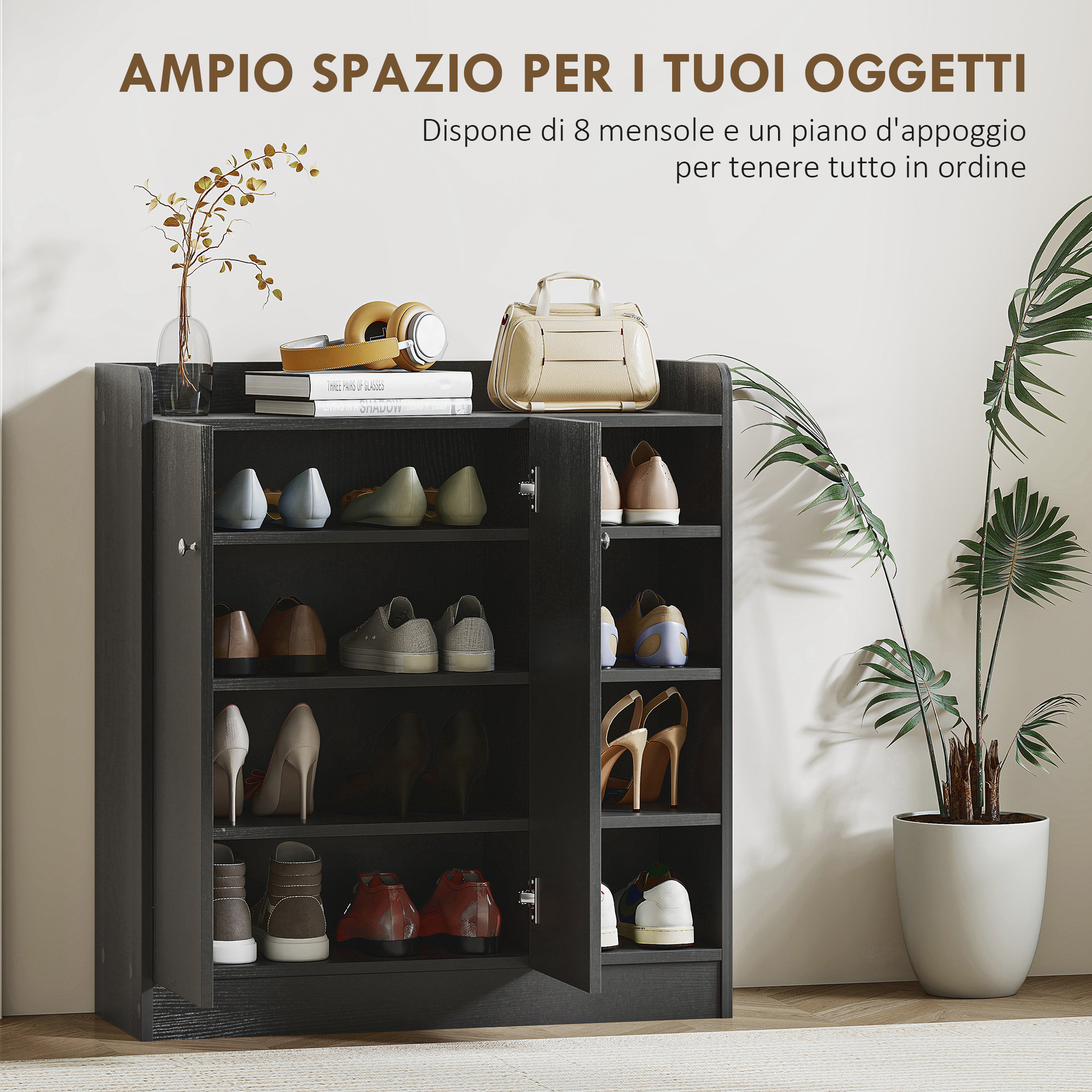 Il nostro mobile scarpiera [ITALFROM HOME DESIGN] è il supporto ideale per organizzare a dovere l’ingresso di casa e trovare un posto per tutte le tue calzature, La struttura possiede infatti 4 ripiani aperti che puoi usare per sistemare le scarpe che usi di più, e un armadietto a 2 ante in cui riporre altre calzature o oggetti, La scarpiera permette di regolare i ripiani per inserire calzature di diverse dimensioni ed è realizzata in truciolato per offrire la giusta solidità,