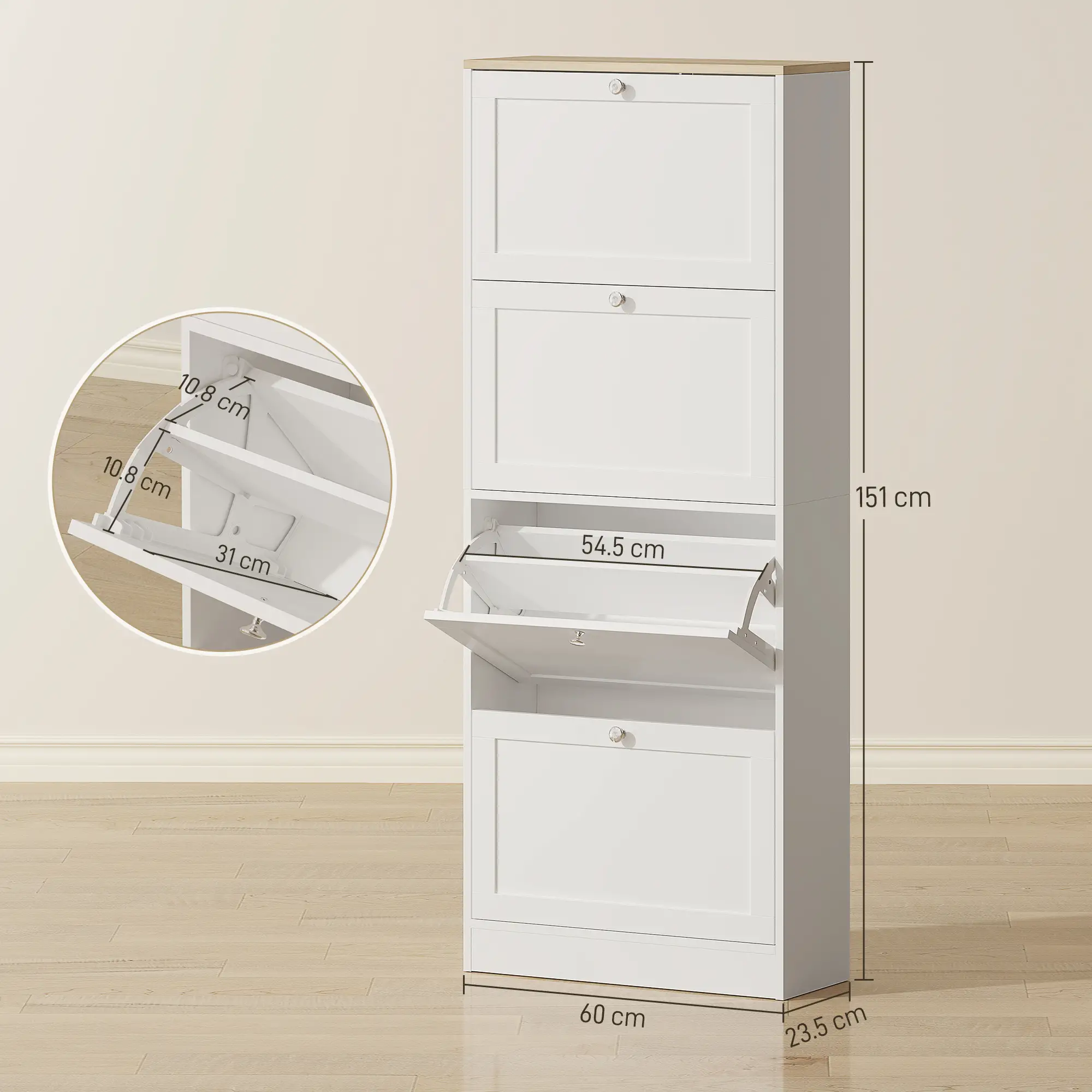 - • I 4 cassetti ribaltabili della scarpiera da ingresso possono contenere fino a 18-24 paia di scarpe (taglia massima: EU 44,5)