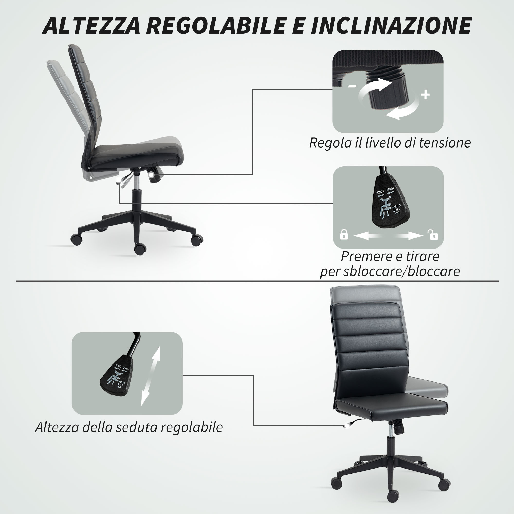 Sedia da Ufficio Ergonomica e Regolabile con Schienale Ricurvo, in Pelle PU e Acciaio, 58x53x97-107 cm, Nero