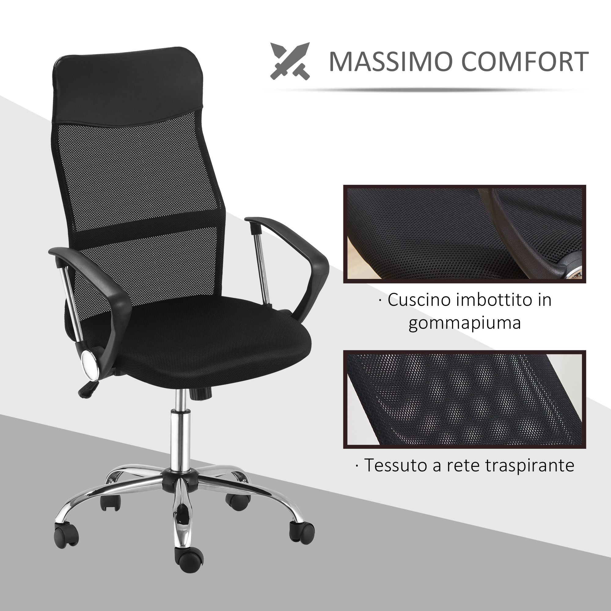 Sedia Ergonomica da Ufficio Girevole e Dondolo con Ruote, Altezza Regolabile e Schienale a Rete, 63x65x109-119 cm, Nero