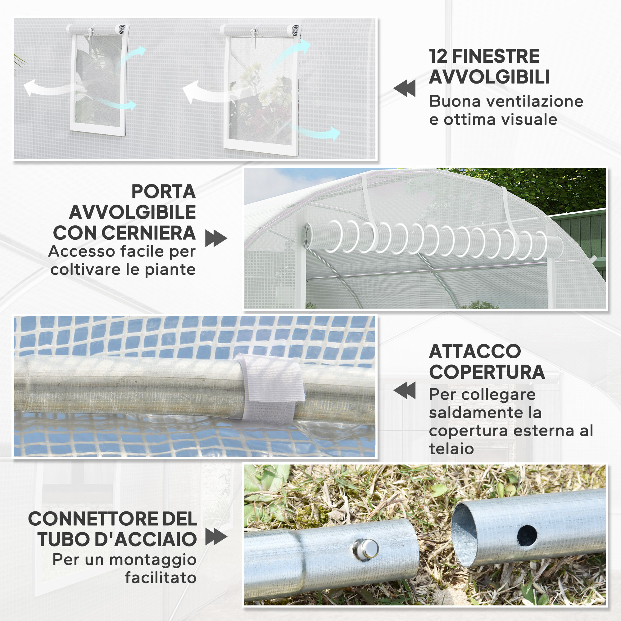 - • 12 finestre a rete avvolgibili sono distribuite su entrambi i lati della serra a tunnel