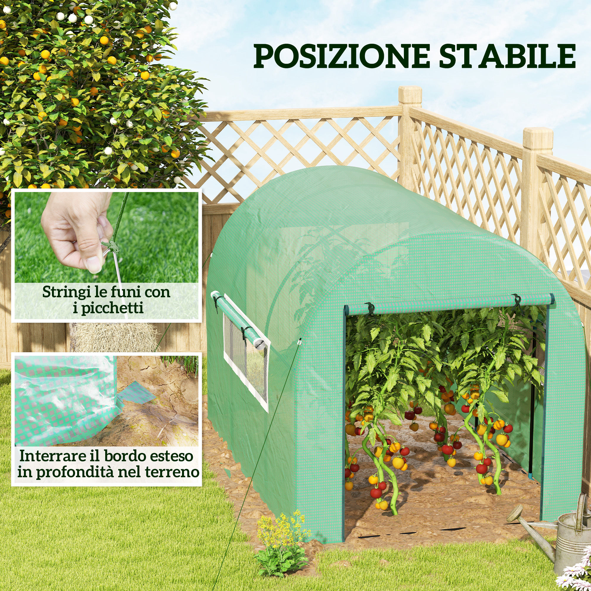 Serra a Tunnel per Orto 3x2x2 m in Acciaio e PE Anti UV con Porte Avvolgibili e Finestre, Verde