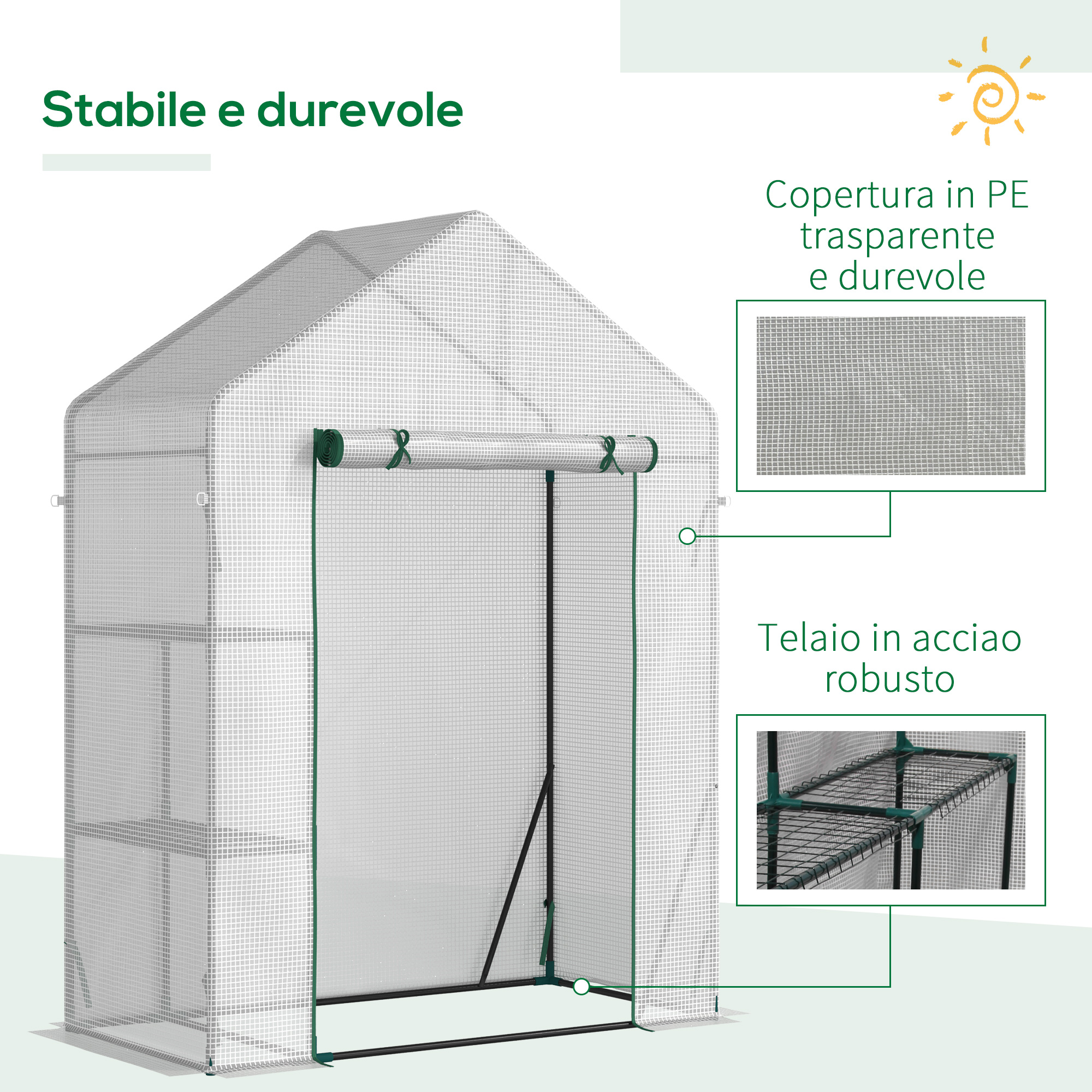 - • Copertura in plastica PE resistente ai raggi UV, all’acqua e al vento