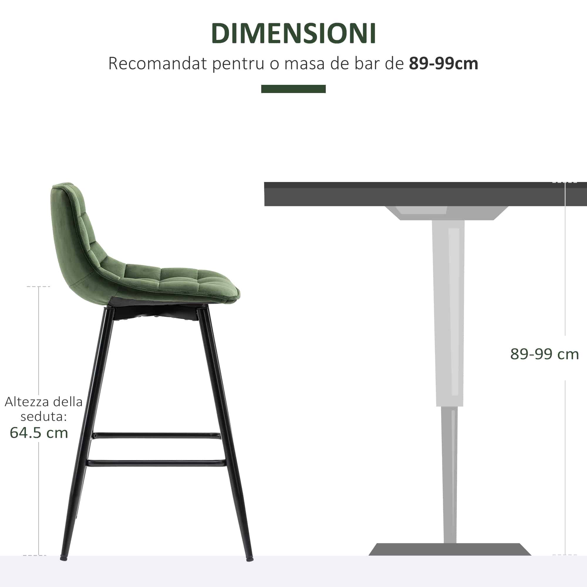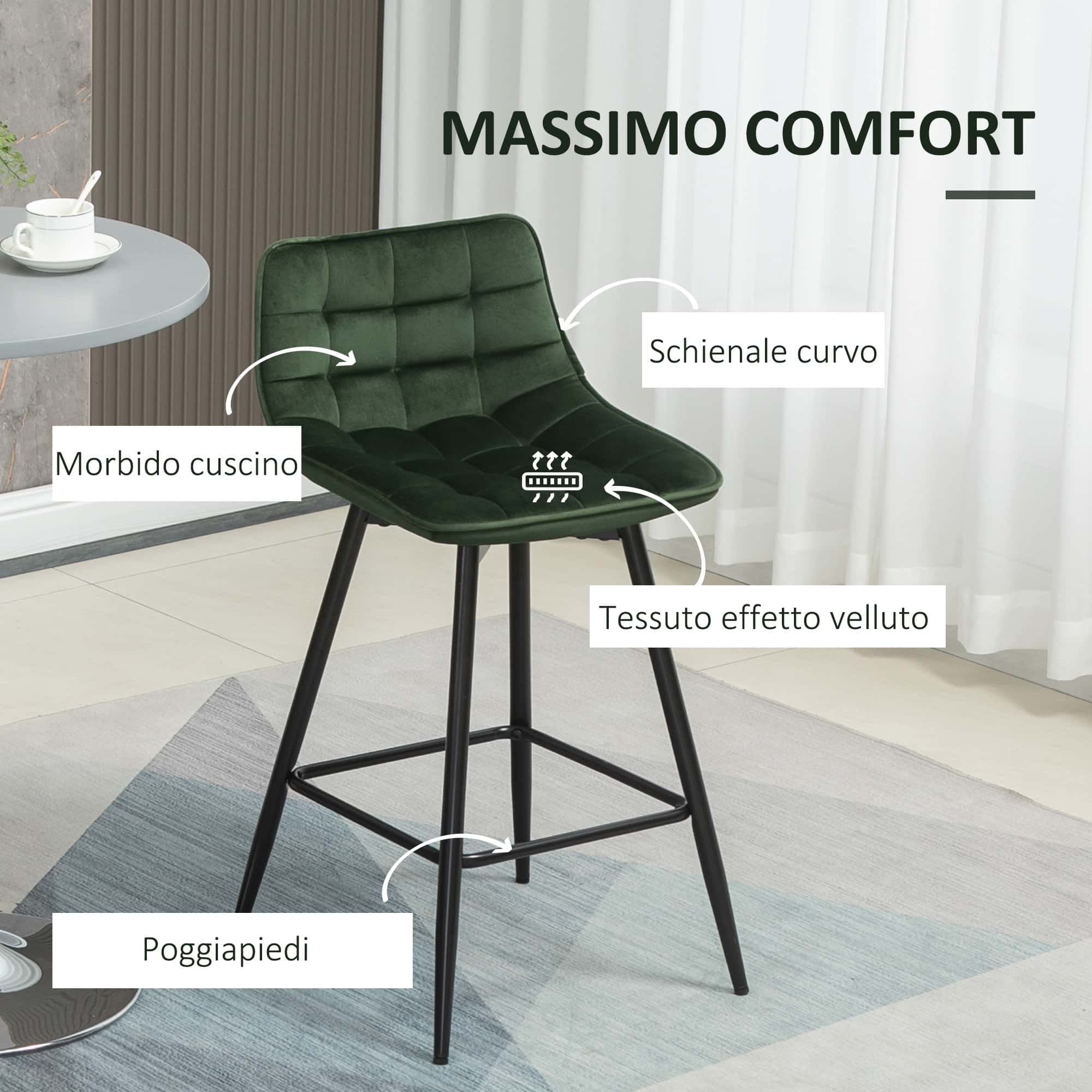 Set 2 Sgabelli da Bar con Schienale e Poggiapiedi Stile Nordico in Metallo e Velluto, Verde, 45x47x84cm