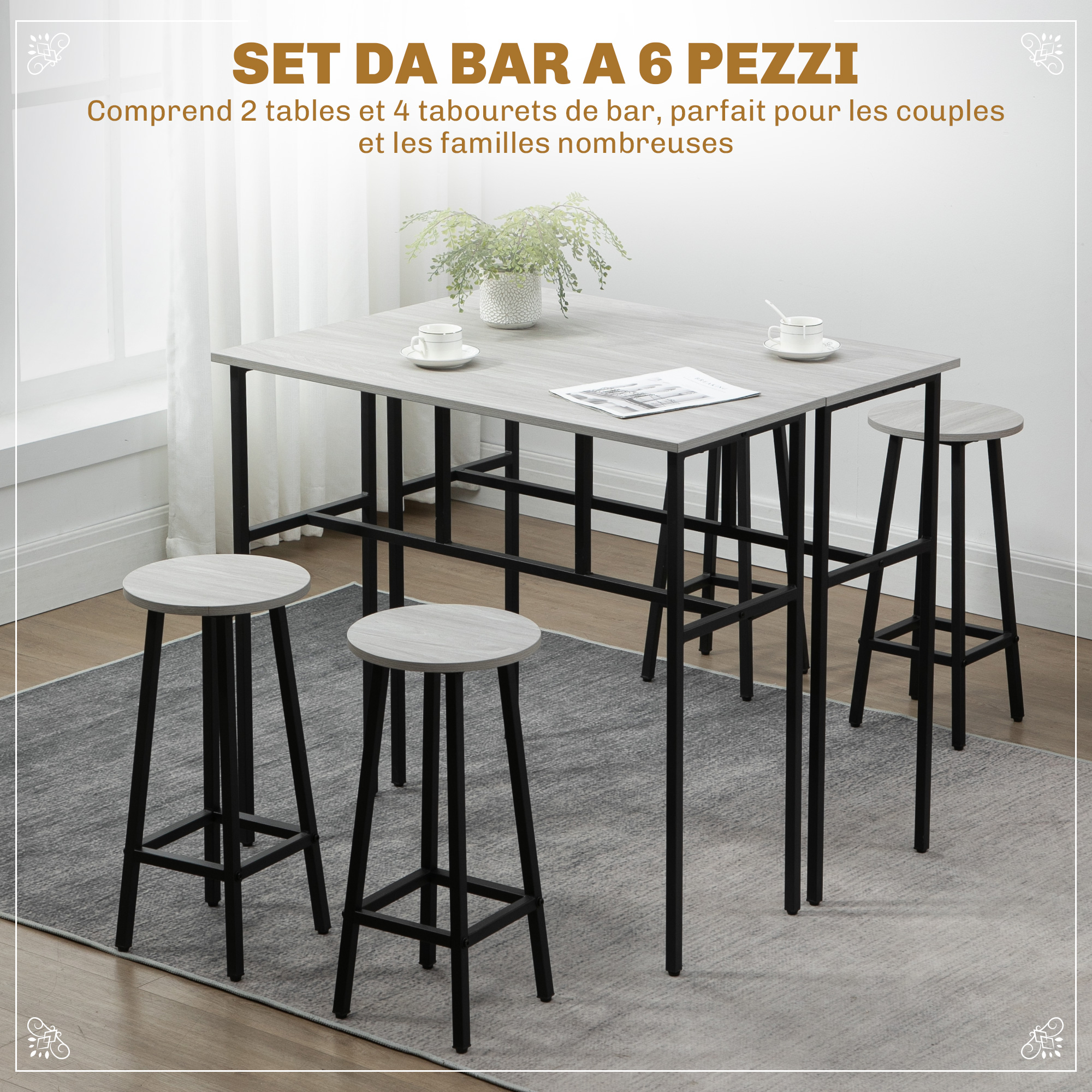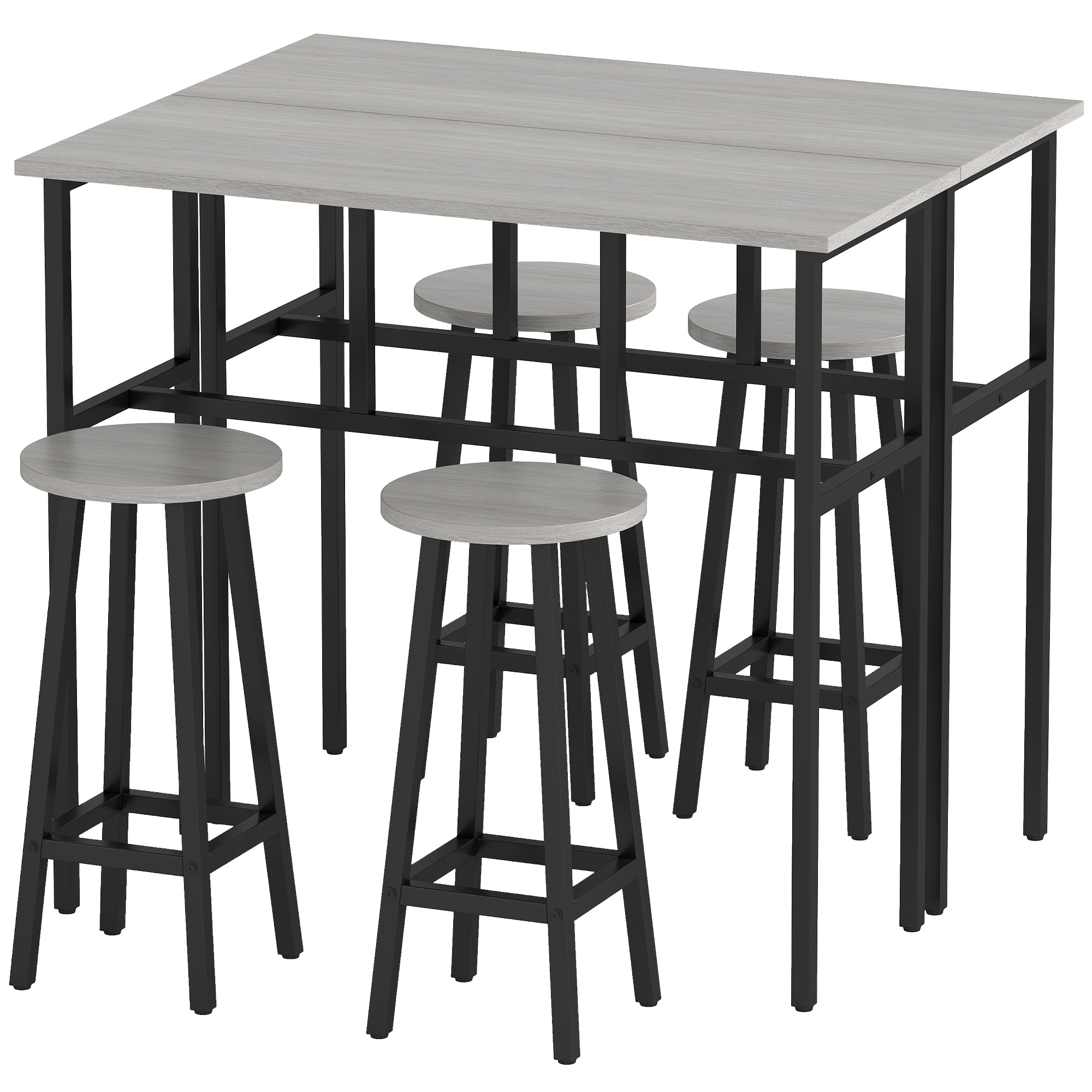 Set da Bar 6 Pezzi con 4 Sgabelli da Bar e 2 Tavoli Alti in Legno Truciolato e Acciaio per Cucina e Soggiorno, Grigio
