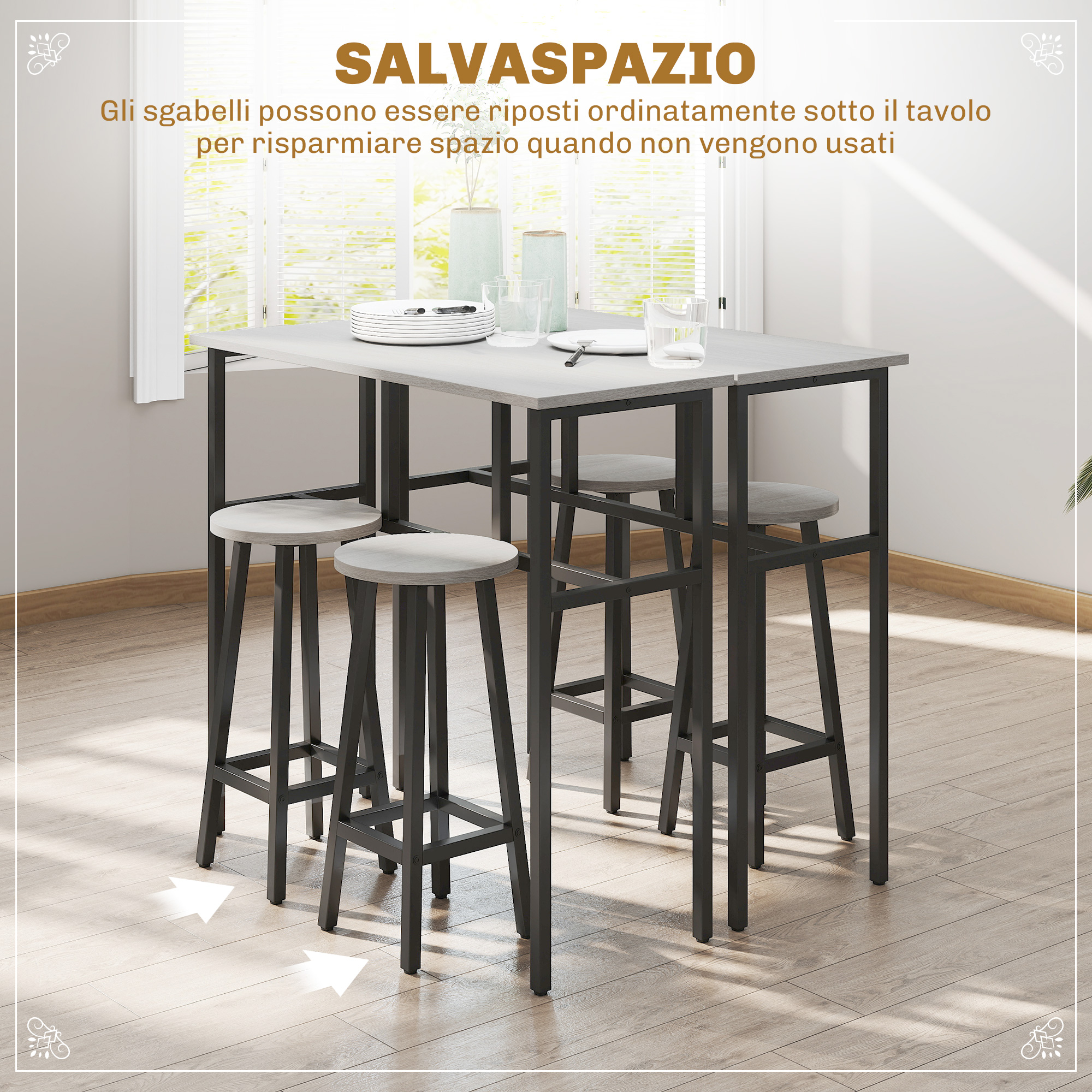 - • Sgabelli possono posizionabili sotto il tavolo