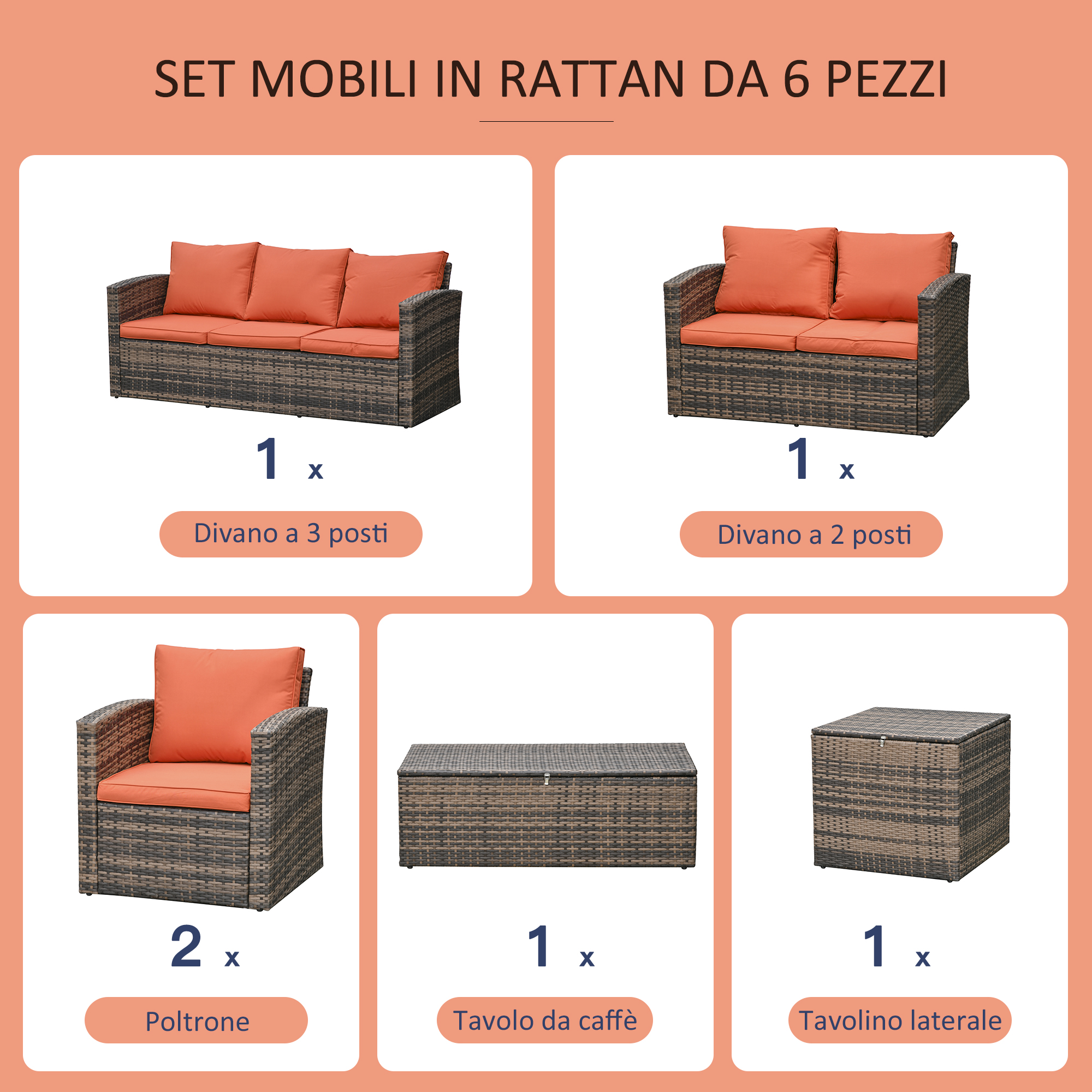 - • Colore: Rattan marrone, Cuscini arancione