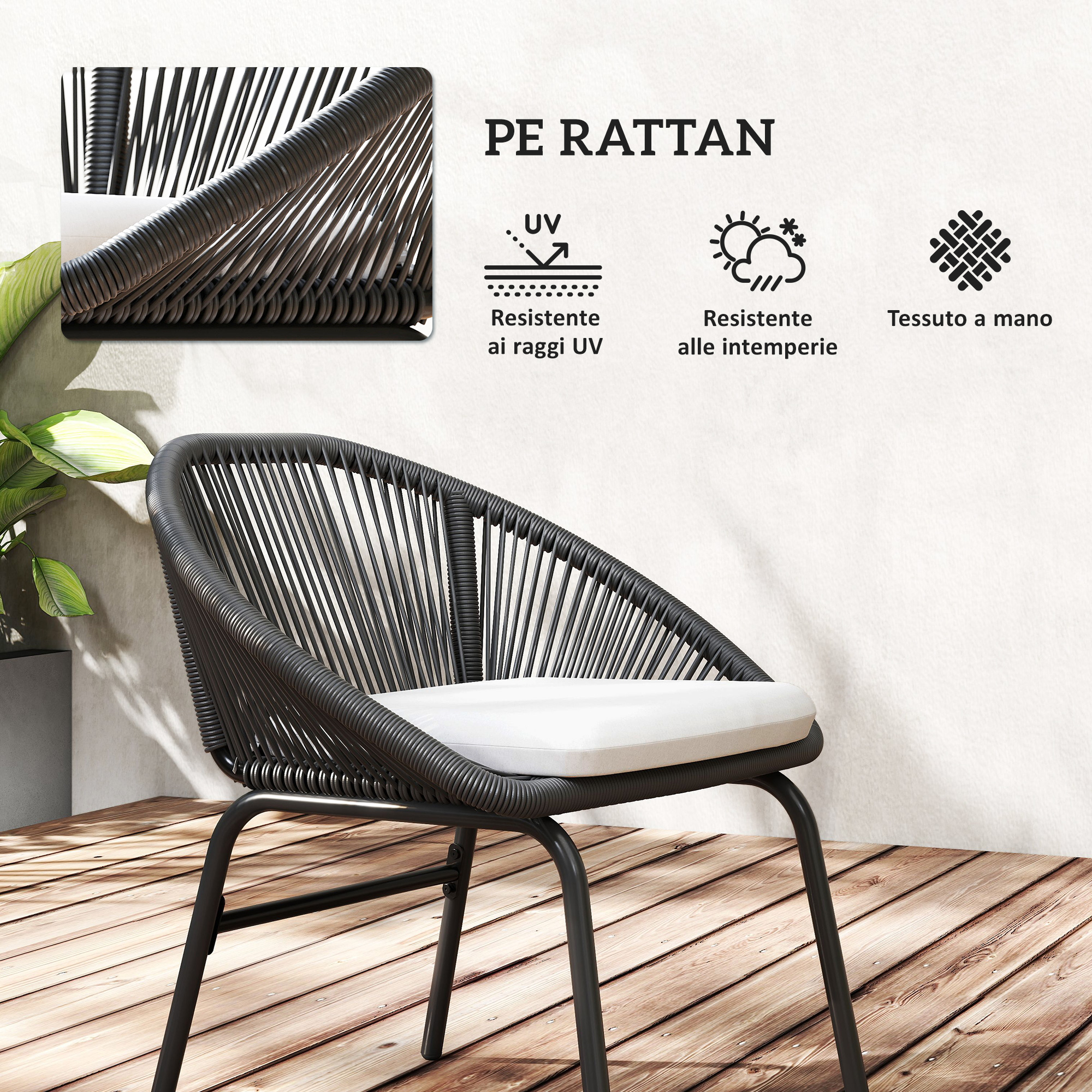 - • Materiali: Rattan PE, acciaio, poliestere