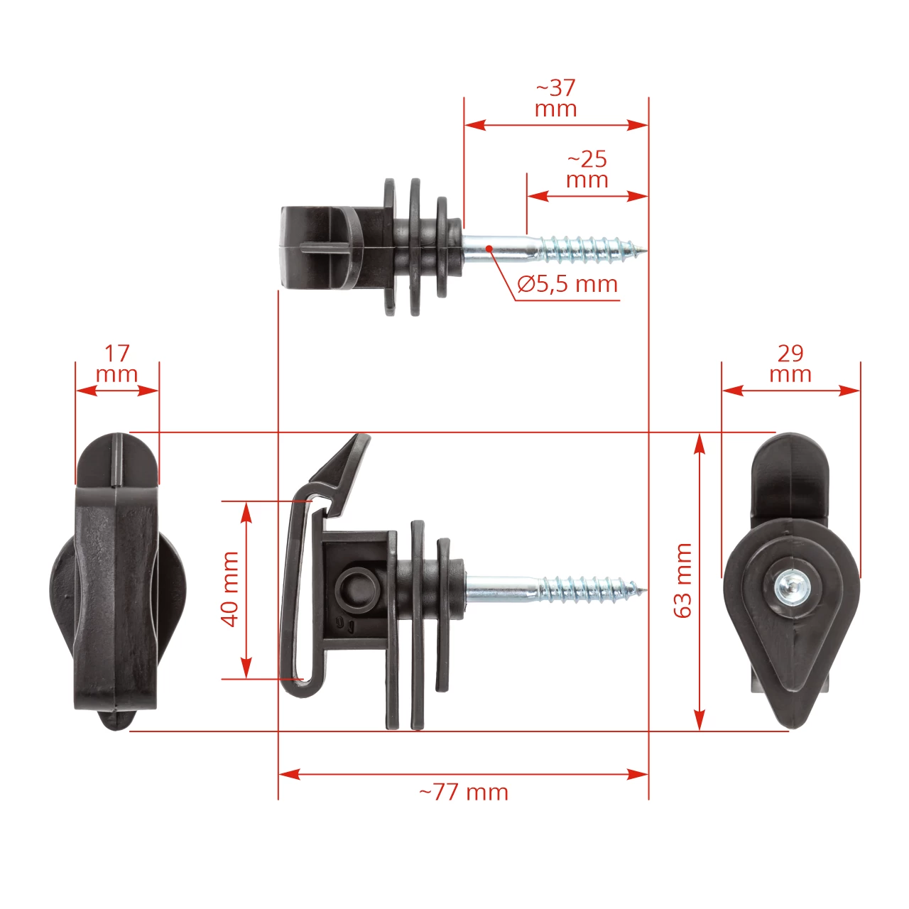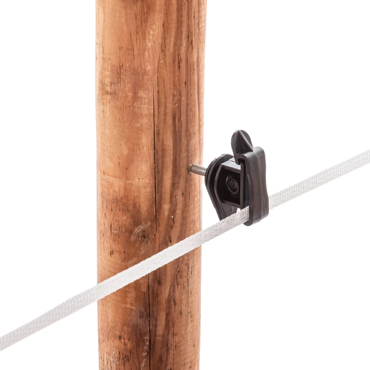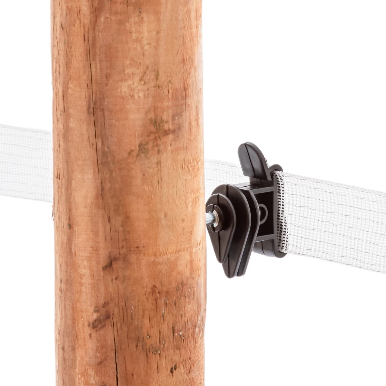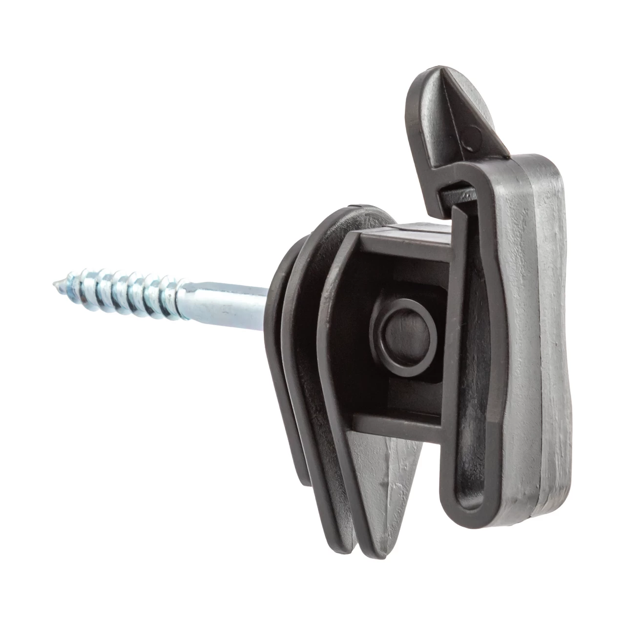 Adatto per nastri con larghezza di 10-40 mm e filo con diametro massimo di 3 milimetri. Materiale in plastica, buon isolante, resistente ai raggi UV, con vite da legno galvanizzato. Grazie alla particolare forma, l’acqua scende facilmente da esso, impedendo così la perdita elettrica del sistema durante la pioggia.