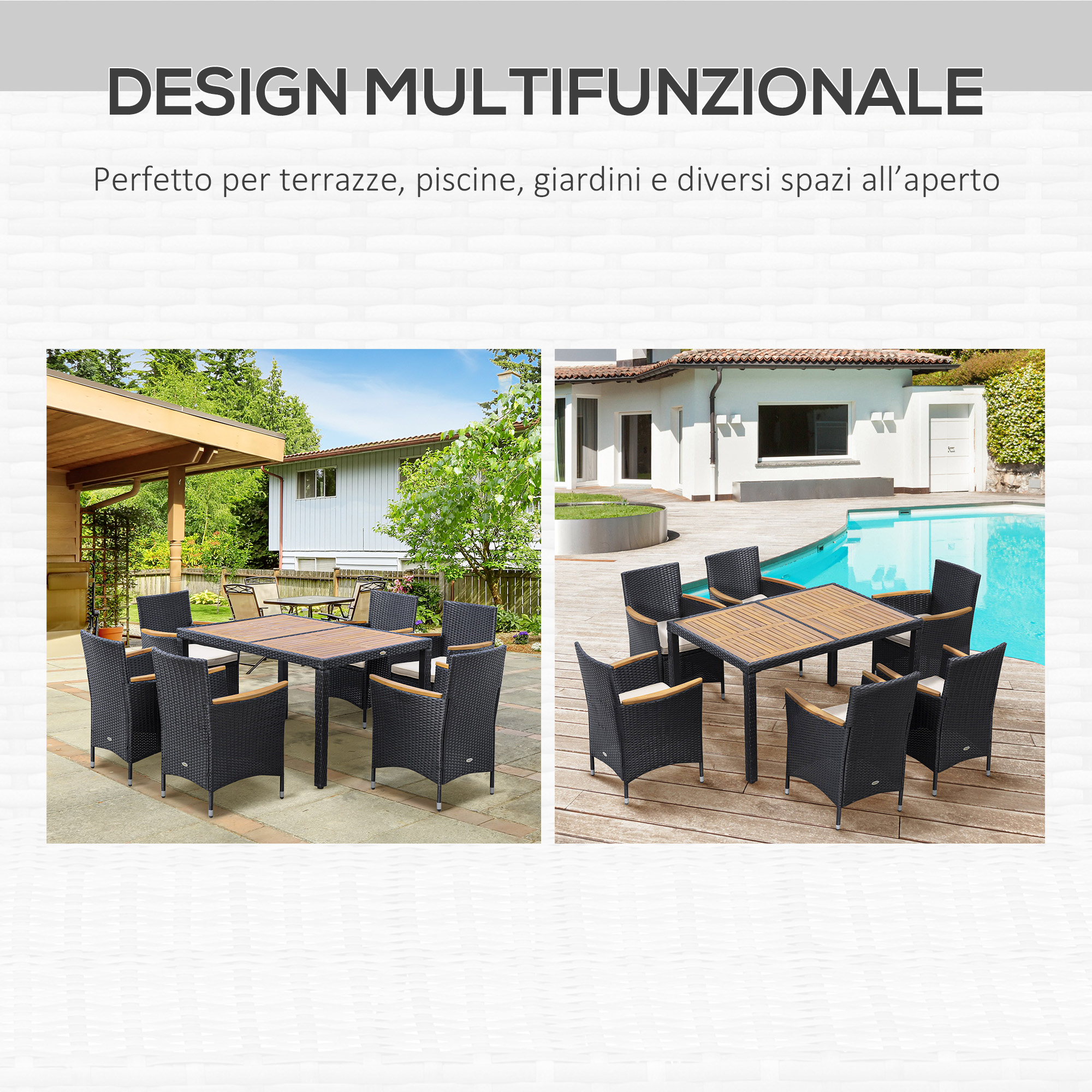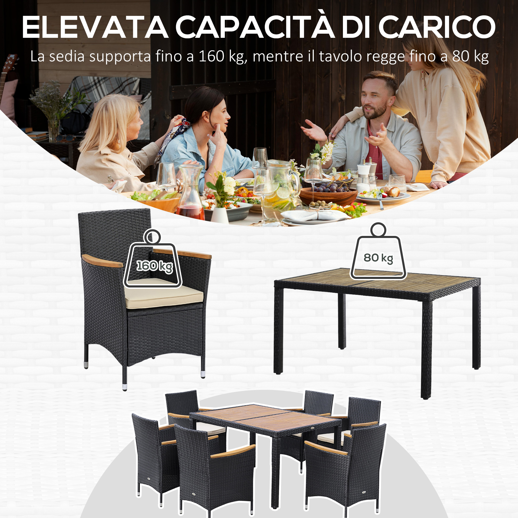 Set Tavolo e Sedie da Giardino 7 Pezzi in PE Rattan e Legno con Cuscini Morbidi, Nero