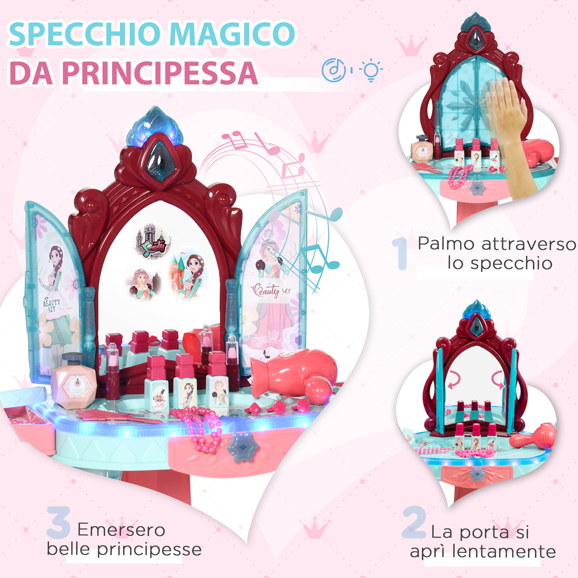 - MUSICA E LUCI: Accendi l’interruttore posteriore, le ante dello specchio si apriranno e partirà la musica mentre 3 splendide principesse appariranno magicamente. Questa toeletta trucco magica farà sentire le bimbe delle vere dive