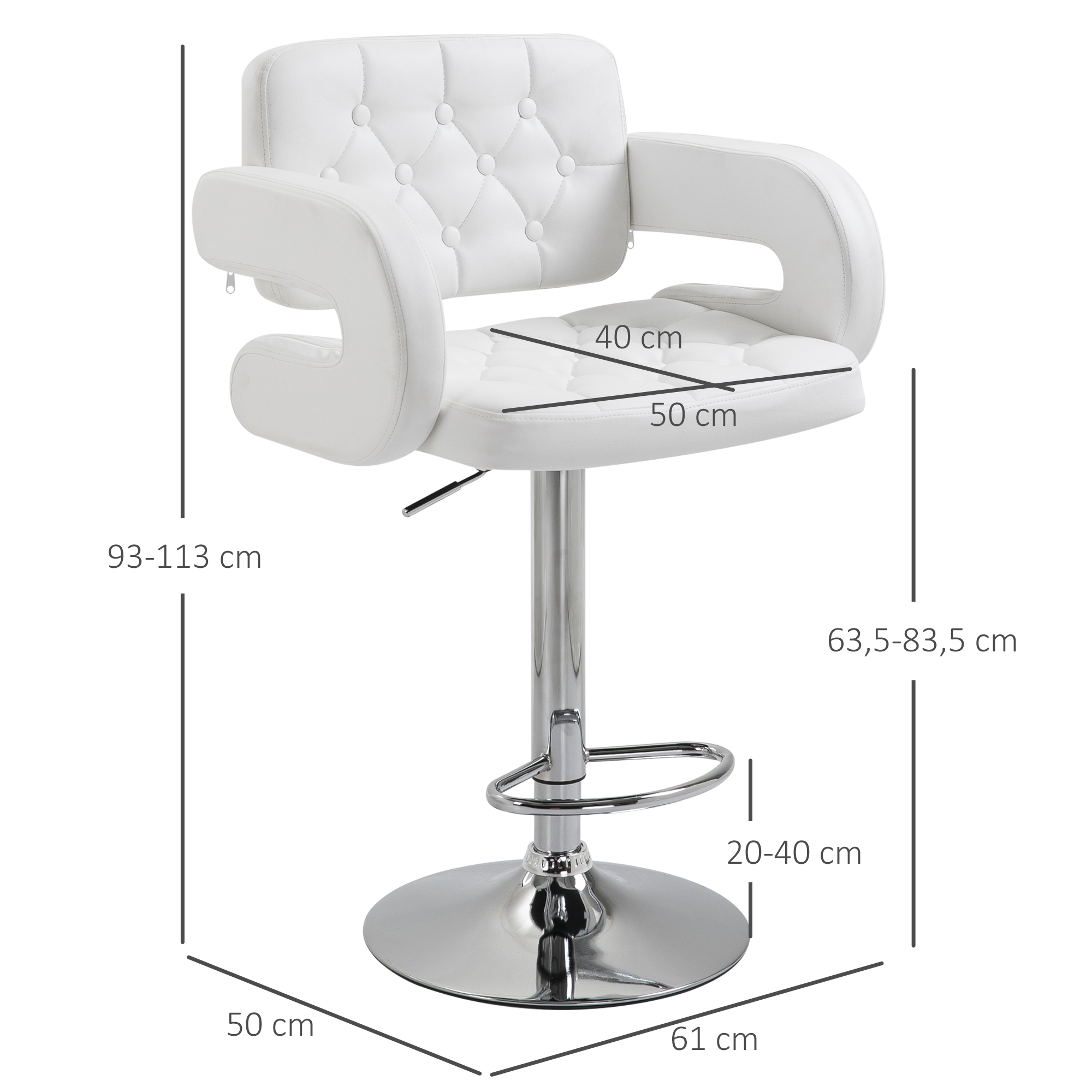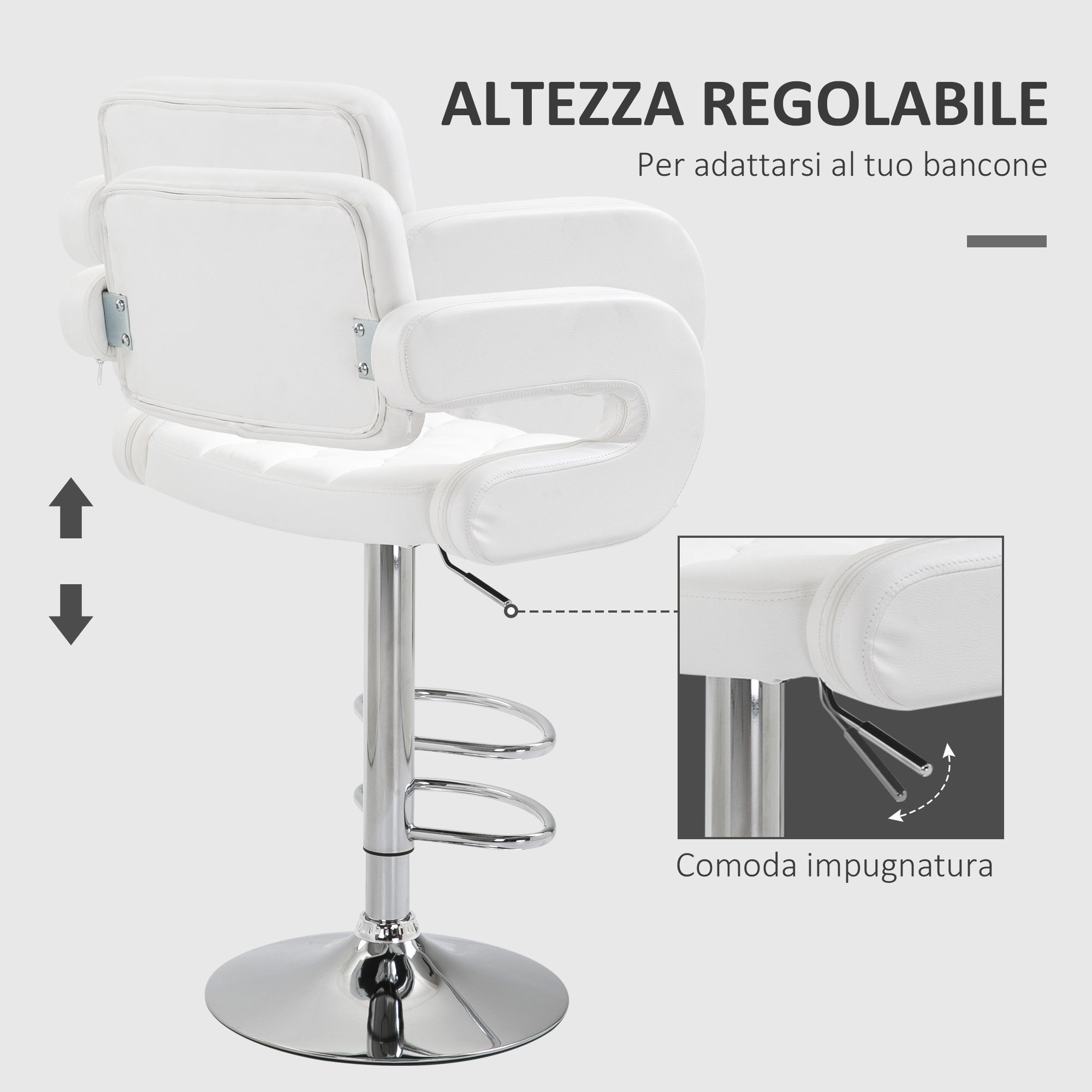 Sgabello Alto Moderno da Bar con Schienale e Braccioli, Regolabile e Girevole, per Cucina o Pub, 64x50x94-114cm, Bianca | Aosom Italy