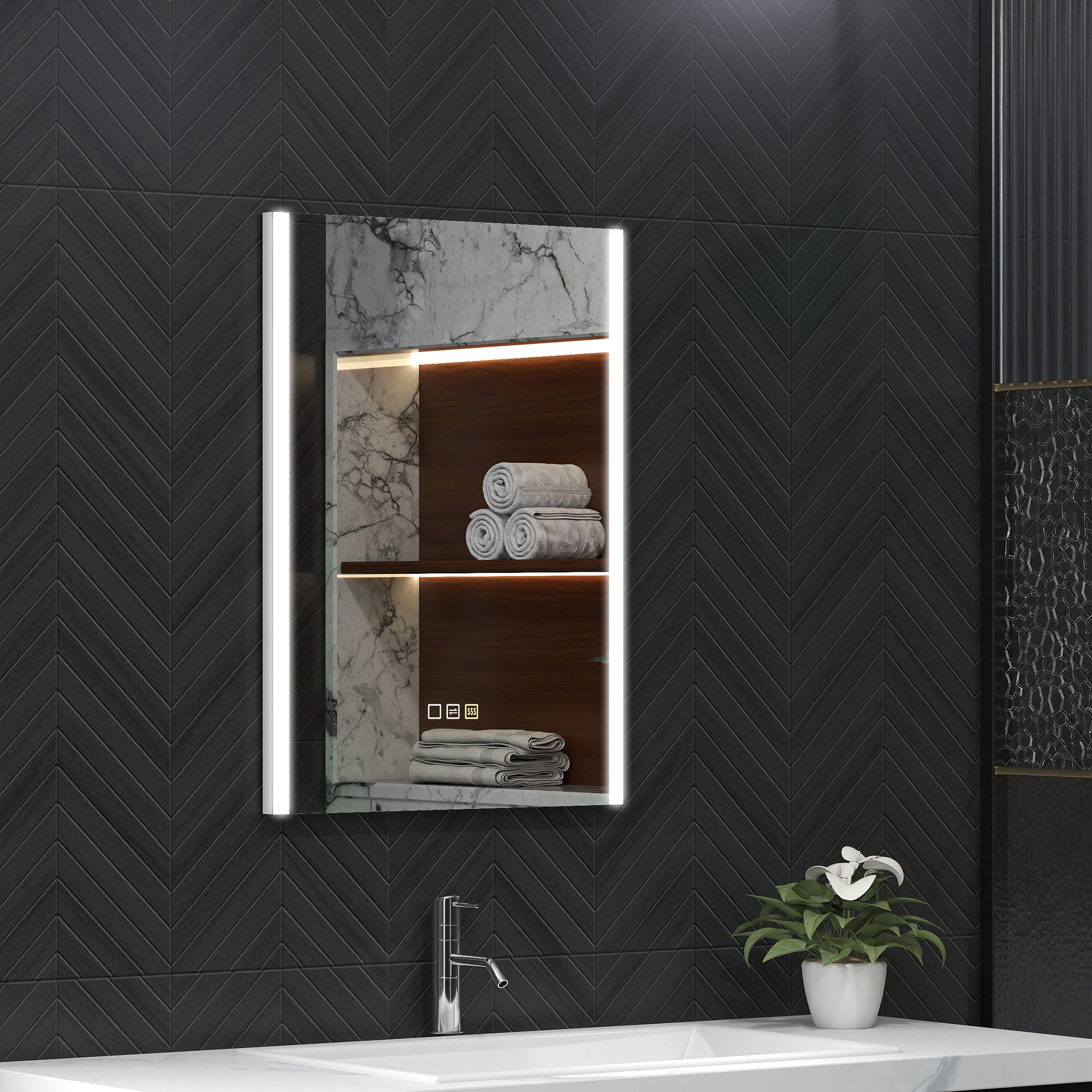 Crea l’ambiente perfetto con un semplice tocco! Che tu preferisca una luce calda per rilassarti, una brillante per iniziare la giornata, o una bianca per illuminare i dettagli, questo specchio da bagno con luci [ITALFROM HOME DESIGN] è un accessorio pratico e di stile, La tecnologia antiappannamento offre una visuale sempre chiara, mentre la presenza di controlli smart touch e la funzione memory rendono la tua routine quotidiana più confortevole e moderna,