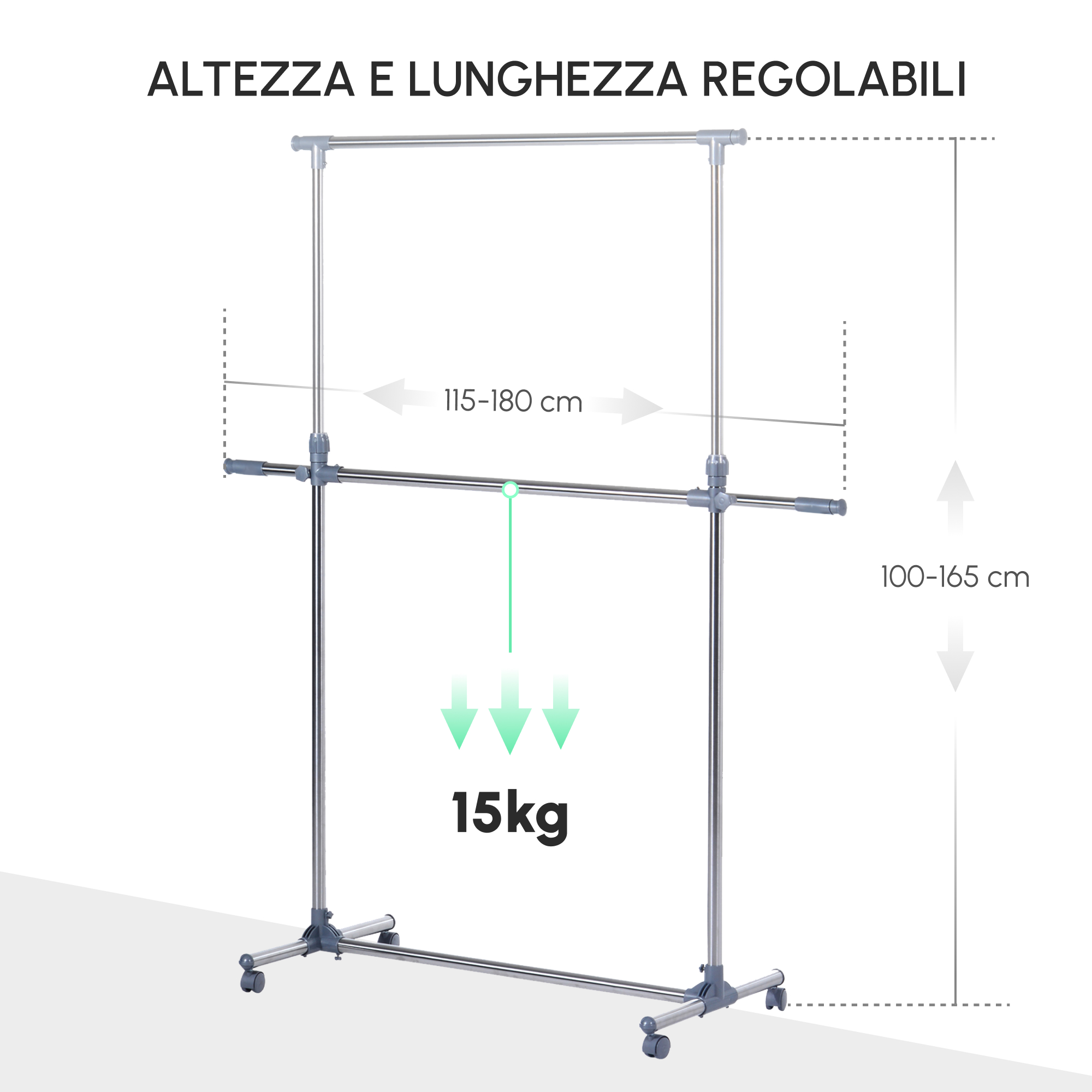 Stender Appendiabiti con Altezza ed Estensione Regolabili, 4 Ruote Girevoli, Acciaio Inox e ABS, 165x48x180cm