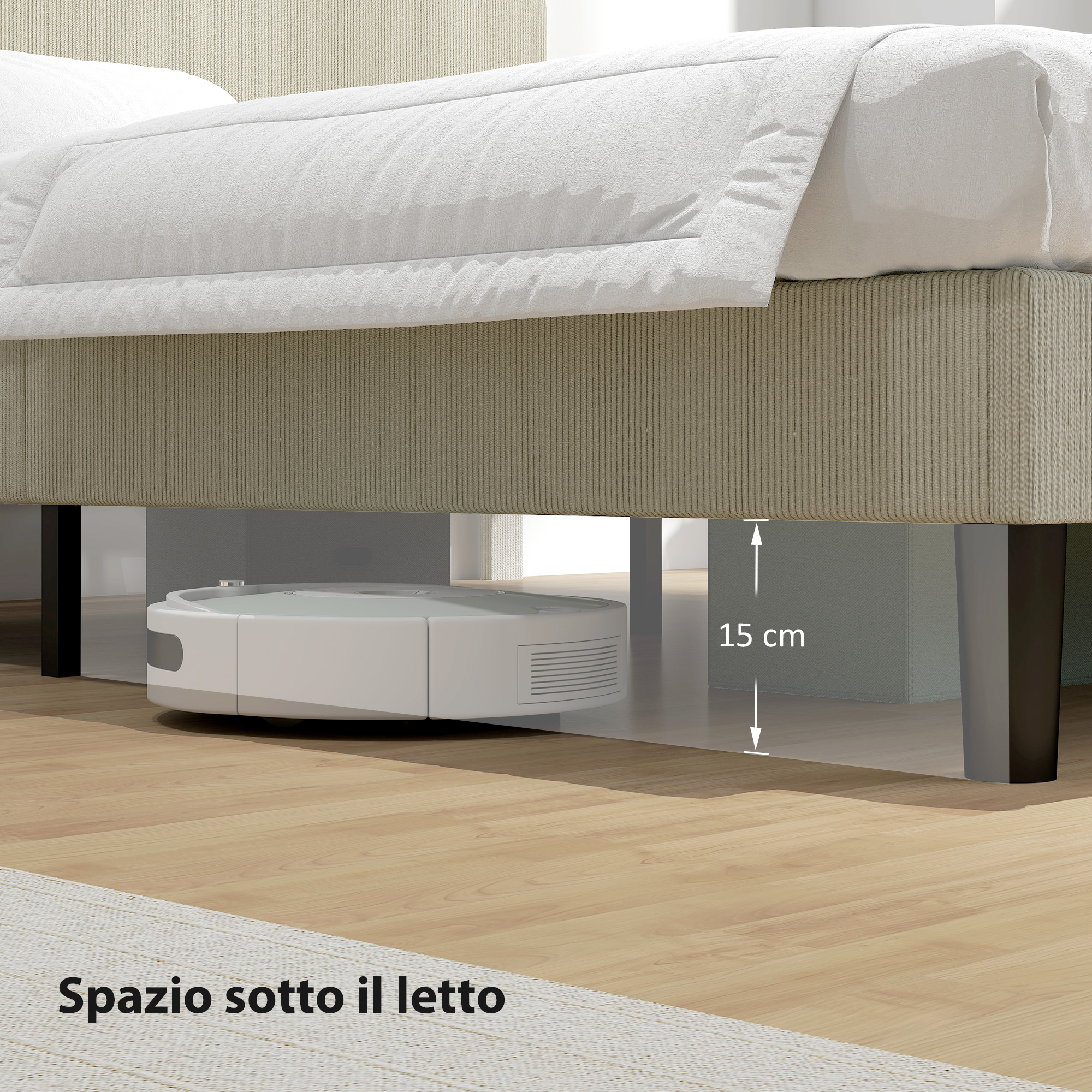 • • 15 cm di spazio libero sotto il letto permettono un facile accesso per la pulizia con robot aspirapolvere