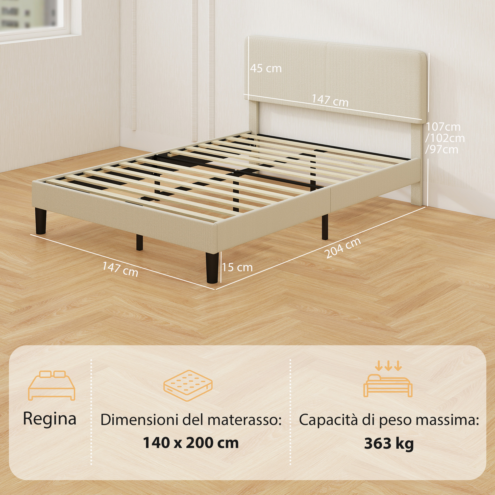 • • Struttura letto con 12 doghe in compensato e gambe in metallo che supportano fino a 363 kg in modo sicuro