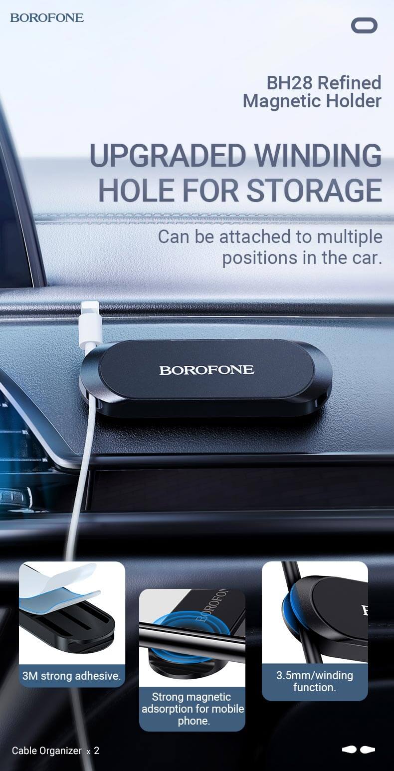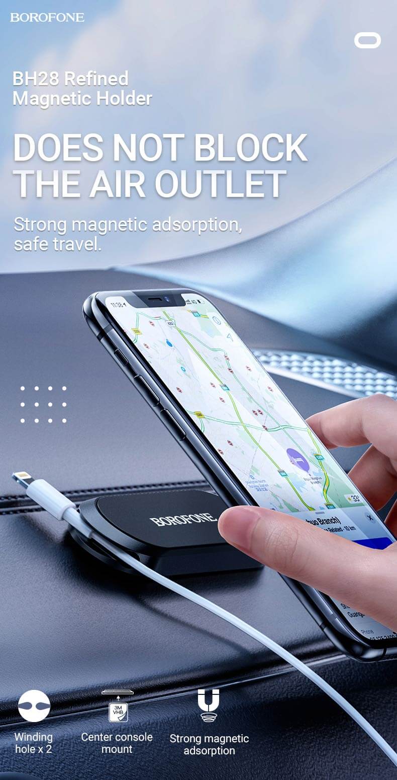 Supporto Magnetico Universale BOROFONE BH28BOROFONE BH28 – Raffinato Supporto Magnetico UniversaleIl BOROFONE BH28 è un supporto magnetico universale che combina design raffinato e funzionalità, ideale per l’uso in auto, ufficio o casa. Progettato per mantenere il tuo smartphone in posizione sicura e facilmente accessibile.Materiali e CostruzioneMateriali: plastica e siliconeSuperficie: plastica, liscia al tattoDimensioni e PesoCompatto e leggero, il BOROFONE BH28 è facilmente posizionabile ovunque ne hai bisogno.Dimensioni: 70 x 23.5 x 7.5 mmDiametro del foro: 3.5 mmPeso: 15 gCaratteristiche MagneticheDotato di 4 potenti magneti N38, il supporto BOROFONE BH28 garantisce una presa stabile e sicura per il tuo smartphone, anche durante la guida.Magneti: 4 x N38Compatibile con smartphone da 4.7 a 6.5 polliciPortata massima: 500 gApplicazioni VersatiliIl BOROFONE BH28 è adatto per l’uso in vari ambienti, come l’auto, l’ufficio o la casa, offrendo la massima versatilità e comodità.
