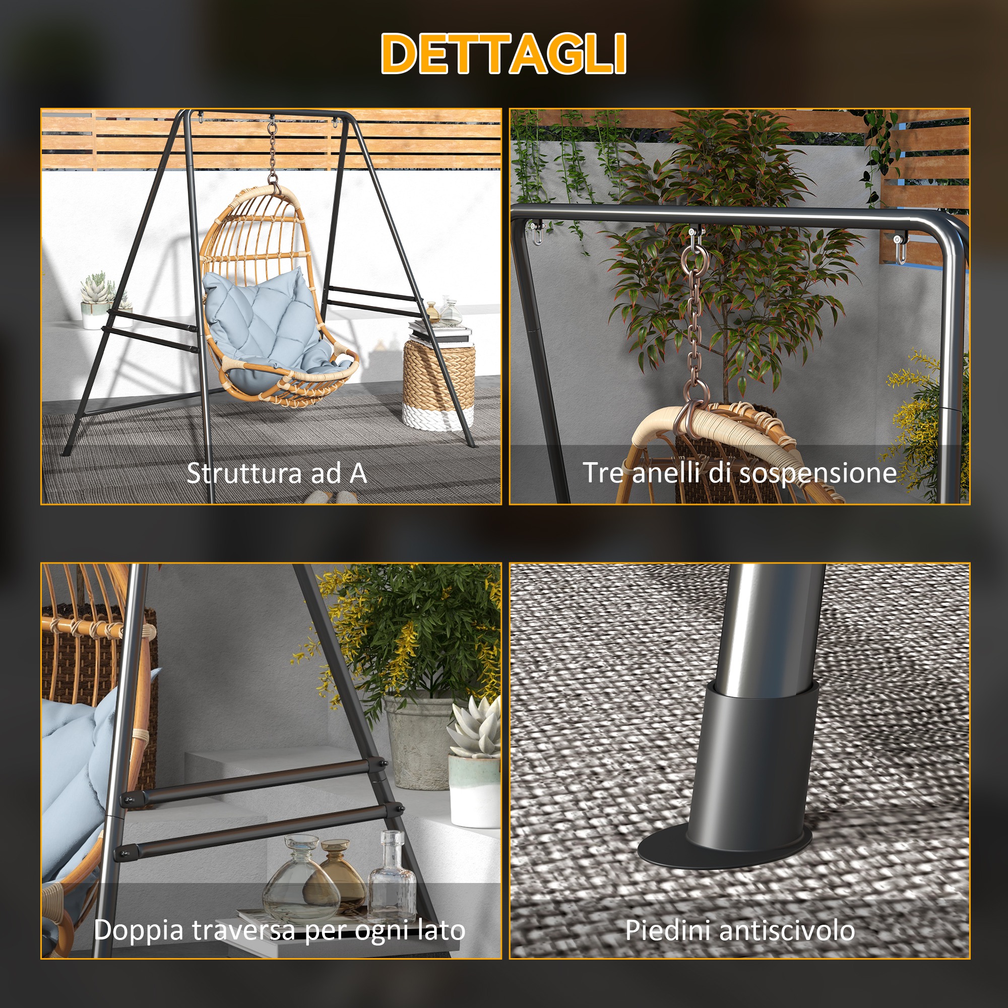 Supporto per Amaca e Poltrona a Uovo in Acciaio con Gambe ad A e Agganci Singoli e Doppi, 178x143x180 cm, Nero