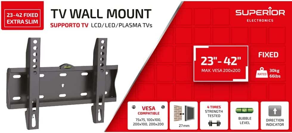 Supporto TV Fixed Extra Slim 23″-42″ SUPSTV001Supporto TV Fixed Extra Slim 23″-42″ SUPSTV001Descrizione del ProdottoIl Supporto TV Fixed Extra Slim 23″-42″ SUPSTV001 è progettato per tutti i televisori LCD, LED e PLASMA con dimensioni comprese tra 23″ e 42″. Con un design extra slim, offre un montaggio fisso a parete che ottimizza lo spazio senza compromettere la stabilità e la sicurezza del televisore.Caratteristiche PrincipaliCompatibile con TV da 23″ a 42″Capacità di carico fino a 30 kg (66 lbs)VESA compatibile: 75x75mm, 100x100mm, 200x100mm, 200x200mmSupporto fisso extra slim per un profilo sottile e discretoSpecifiche TecnicheCodice prodotto: SUPSTV001Codice a barre: 8054242080698Materiale: Acciaio robusto per una maggiore durata e sicurezzaContenuti AggiuntiviIl supporto viene fornito con una livella a bolla per un’installazione precisa, indicatori di direzione per facilitare il montaggio e un manuale d’istruzioni dettagliato per una guida passo-passo.