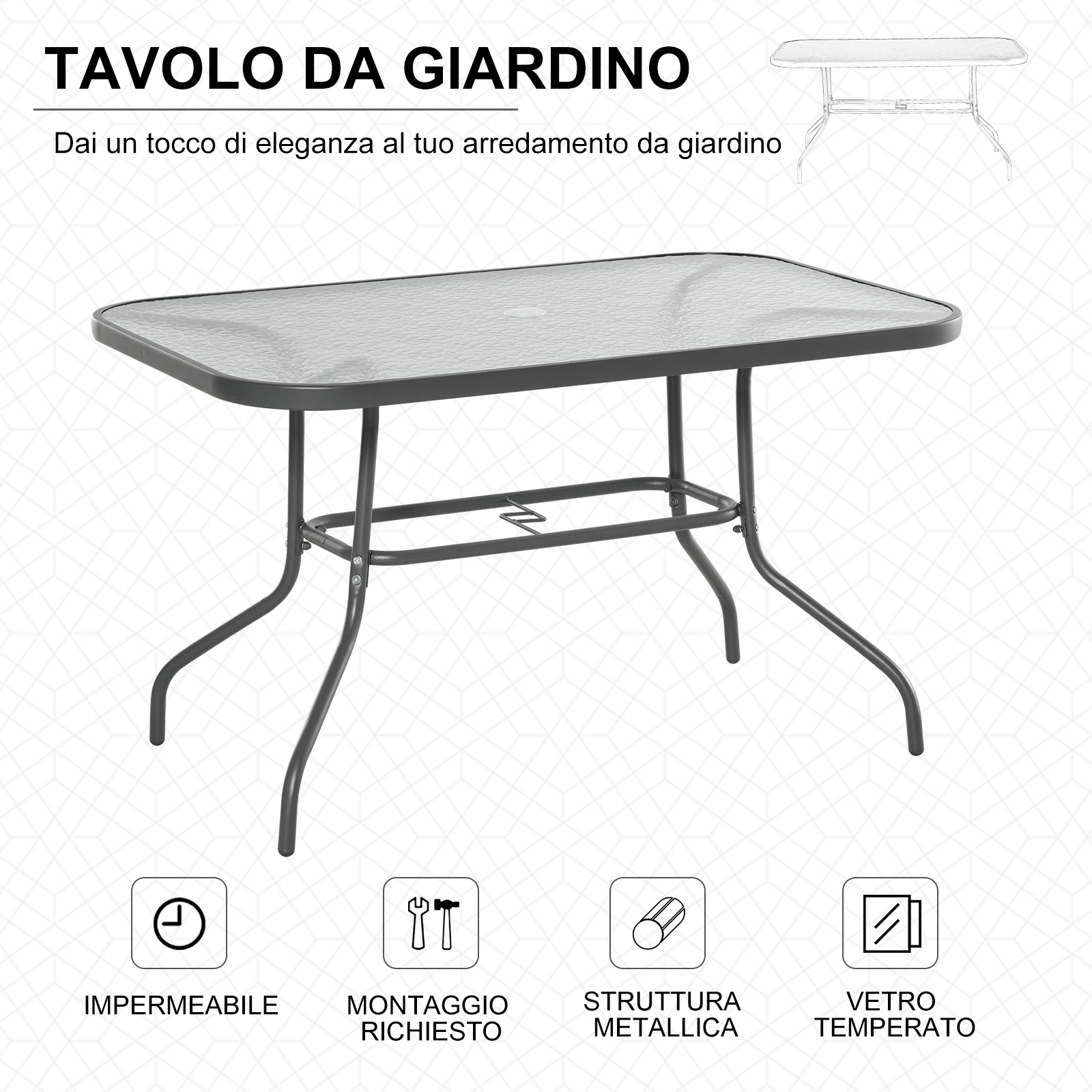 Tavolo da Giardino in Metallo e Vetro con Foro Ombrellone 120x80x70cm