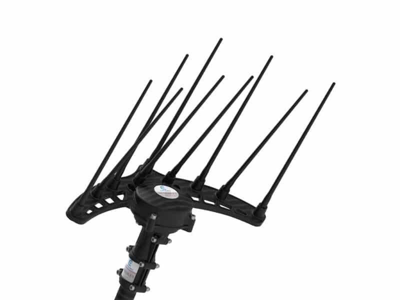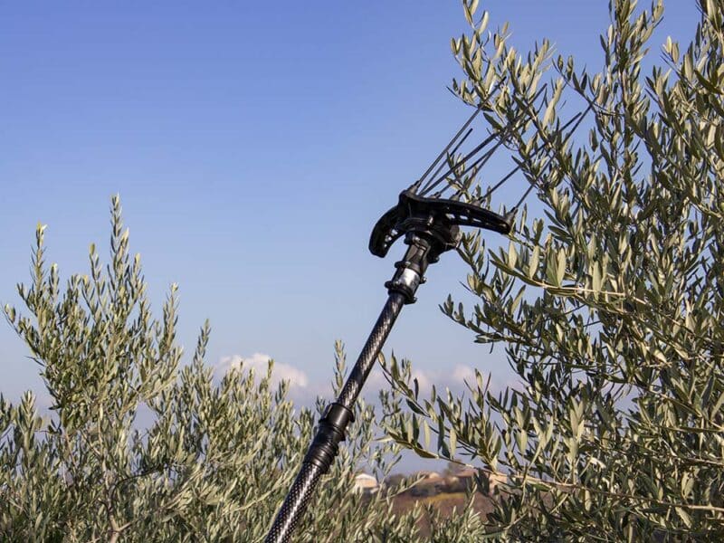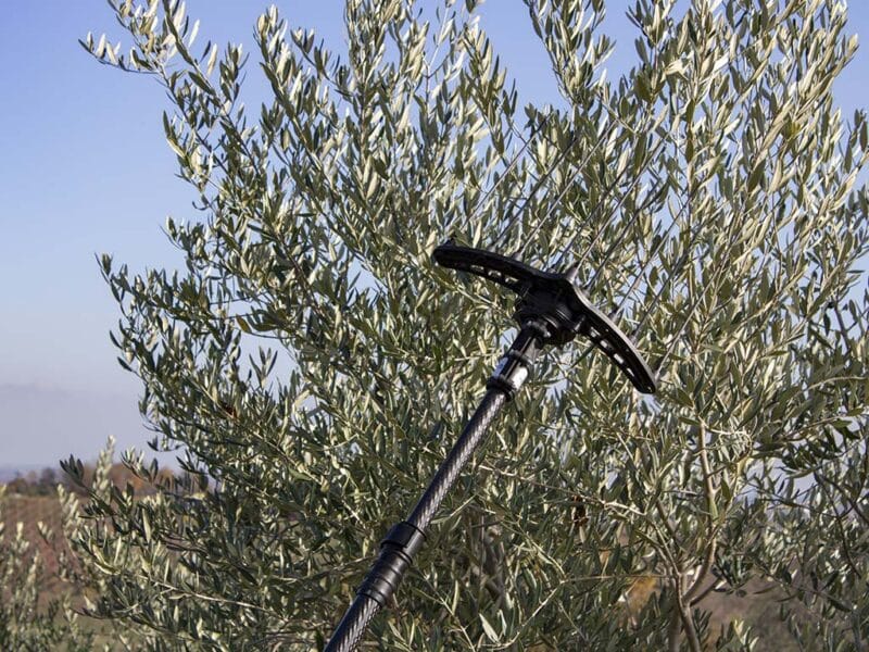I lunghi rebbi in carbonio intercambiabili ed il movimento ellittico gli permettono di penetrare perfettamente tra i rami della pianta.