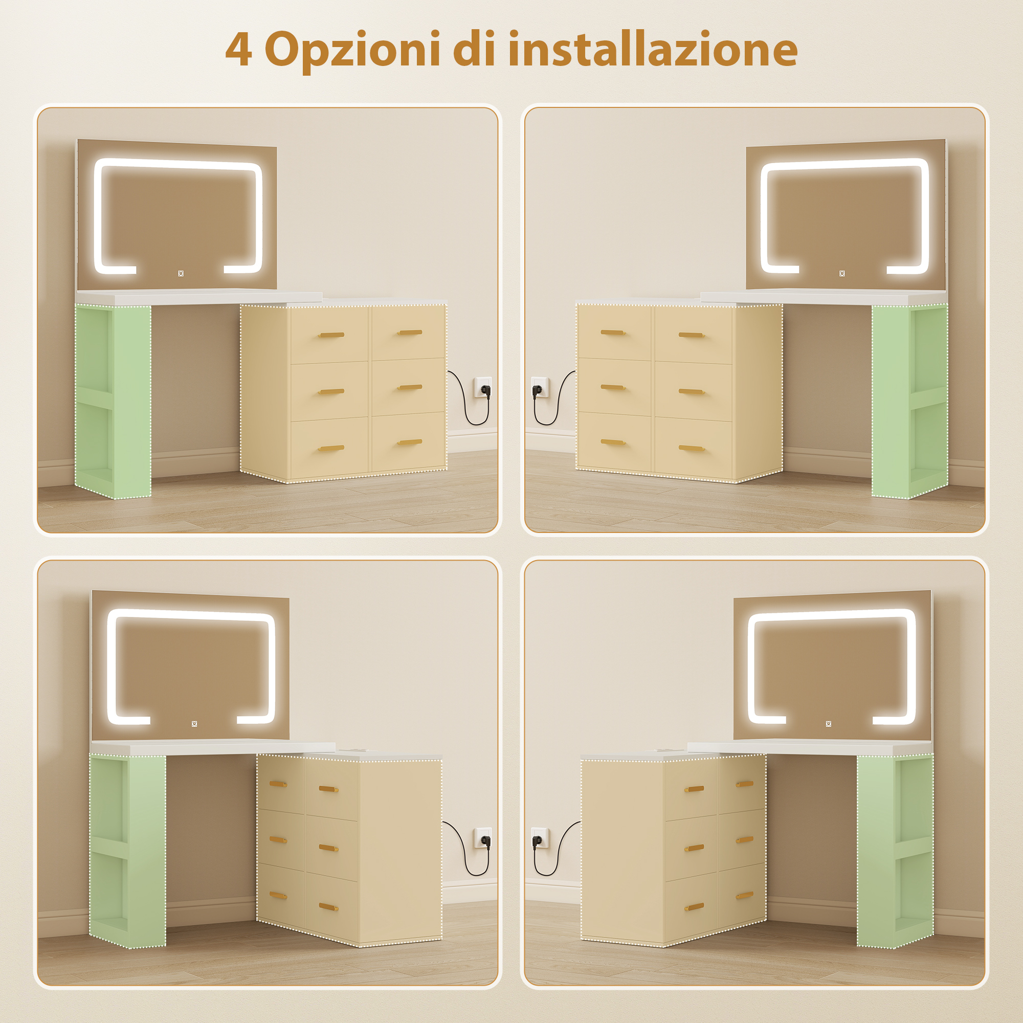- • Quattro opzioni di installazione permettono di scegliere la configurazione del tavolino da trucco che meglio si adatta alle tue esigenze
