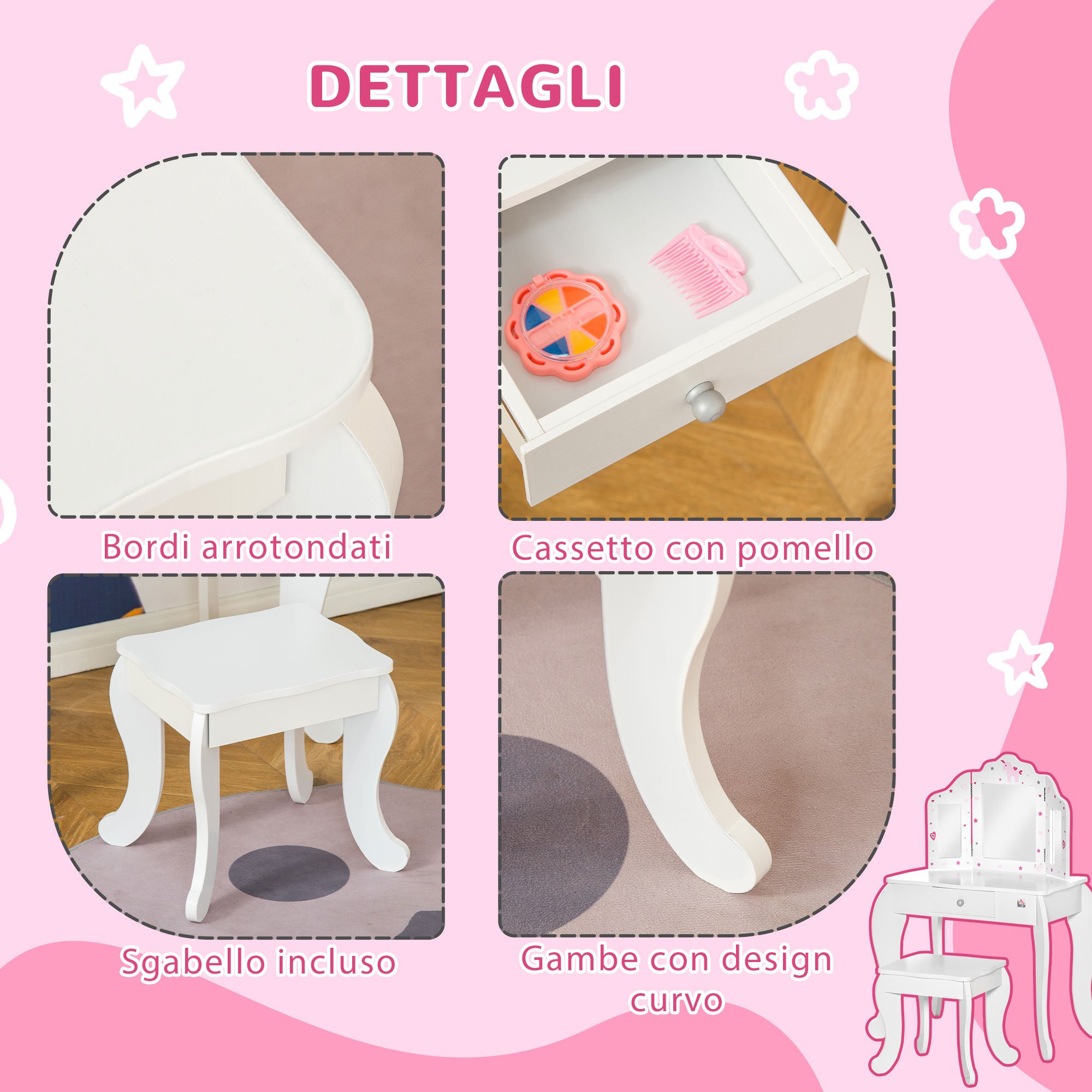 - • Set da 2 pezzi con tavolo toeletta per bambini e sgabello