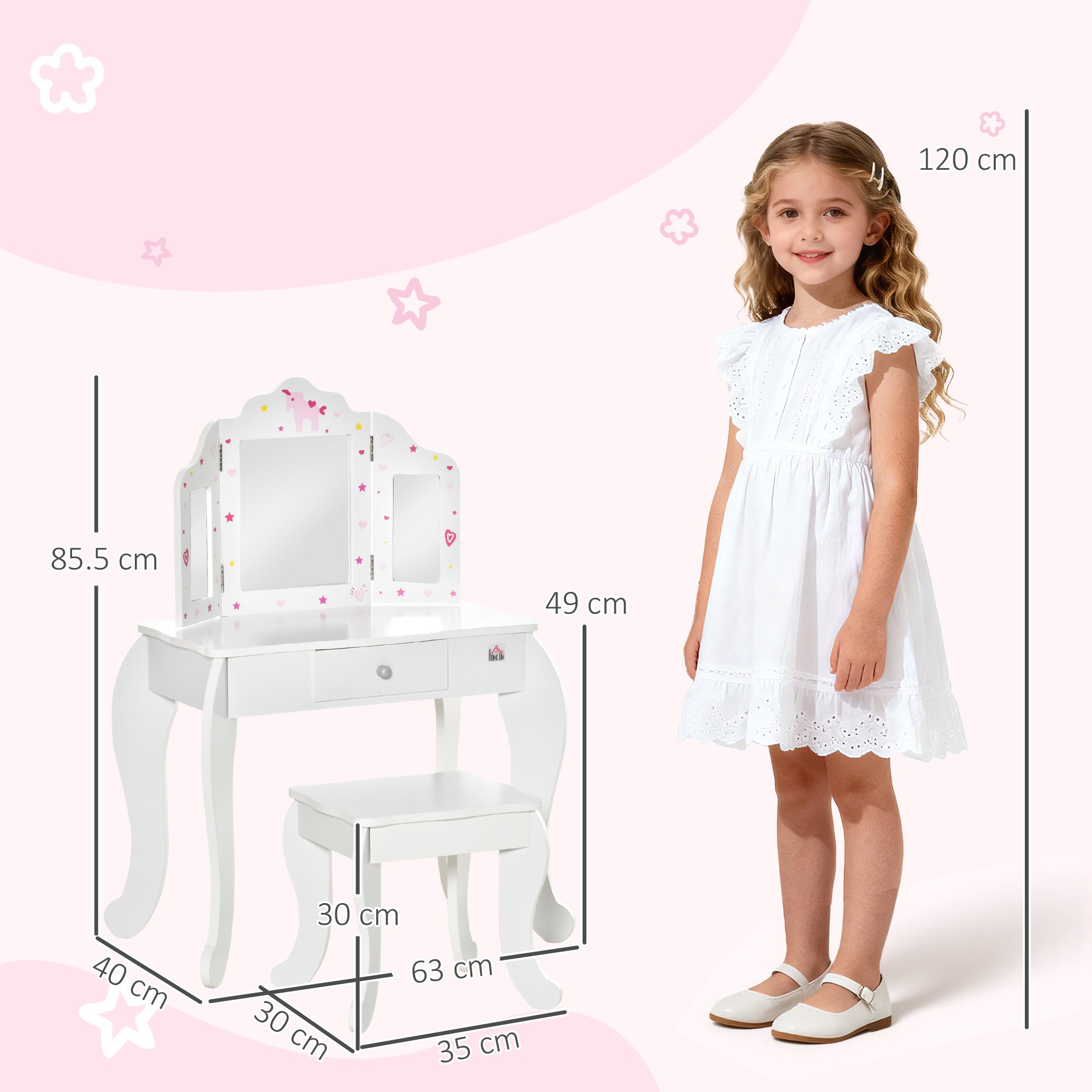 Toeletta per Bambini con Sgabello, Tavolo Trucco con Triplo Specchio e Cassetto, 63x40x85,5cm, Bianco