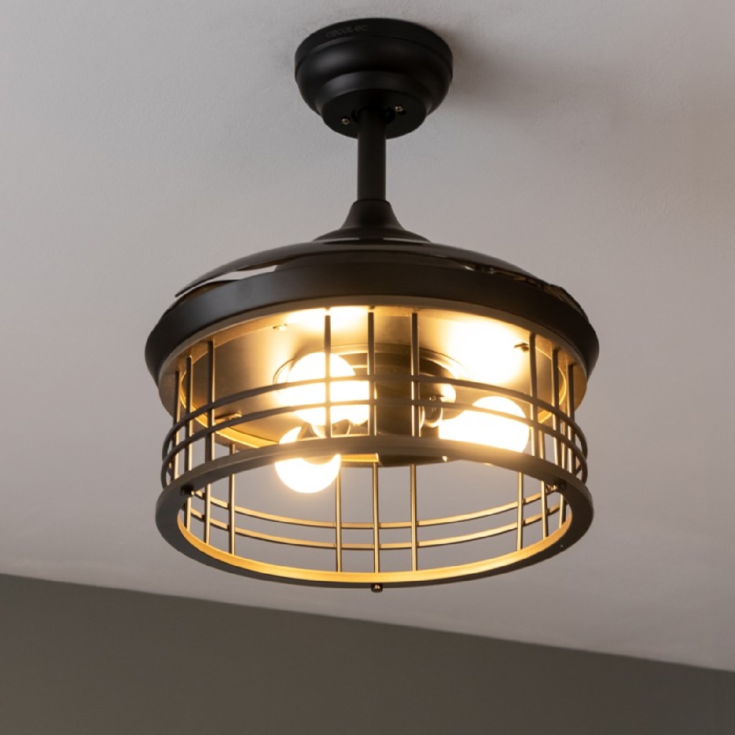 Paralume a griglia nera: il ventilatore è dotato di un paralume a griglia nera che lo copre, creando un’atmosfera estetica ed elegante.