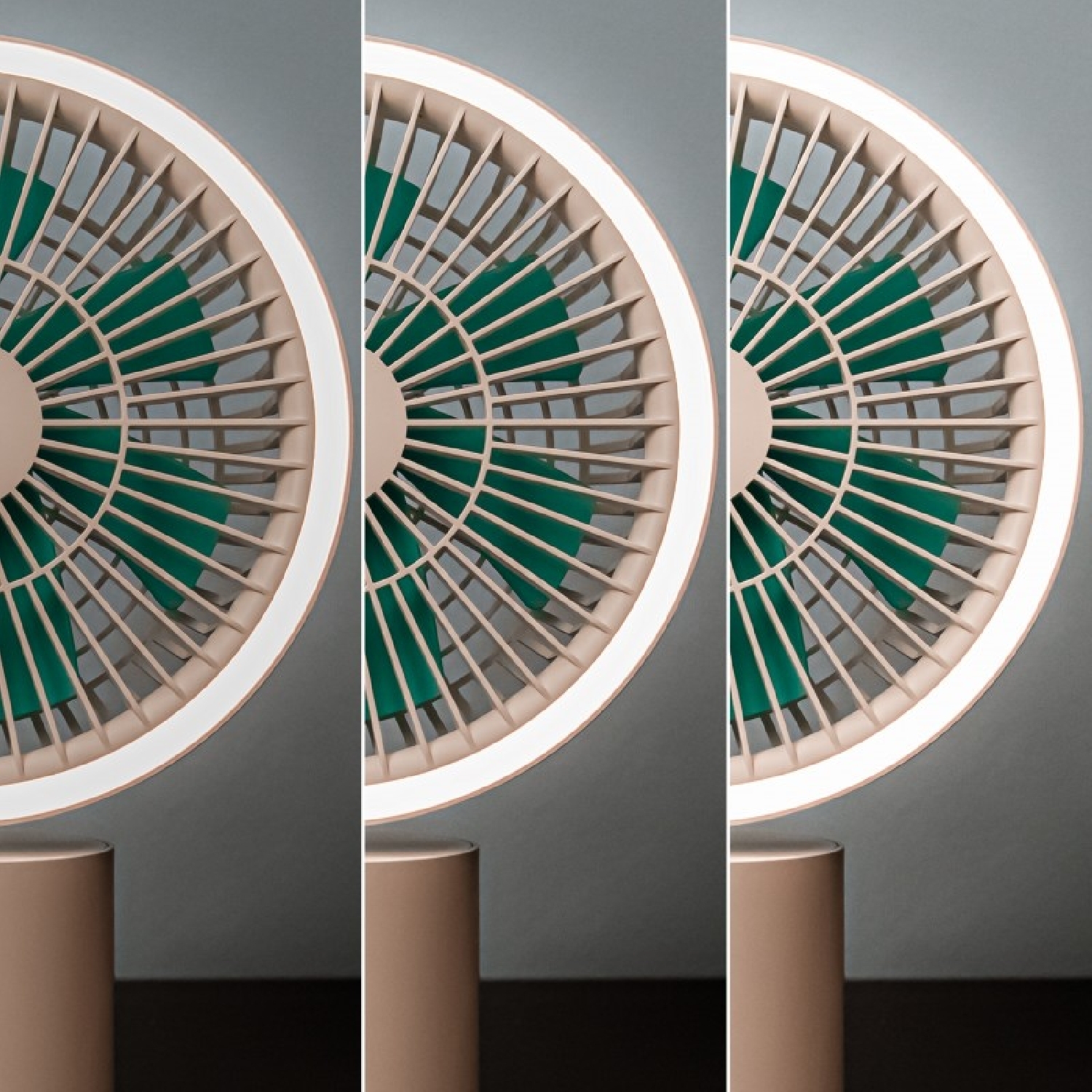 Ventilatore da tavolo con batteria da 8000 mAh, oscillazione a 360º, anello luminoso con 3 tonalità e 4 velocità.