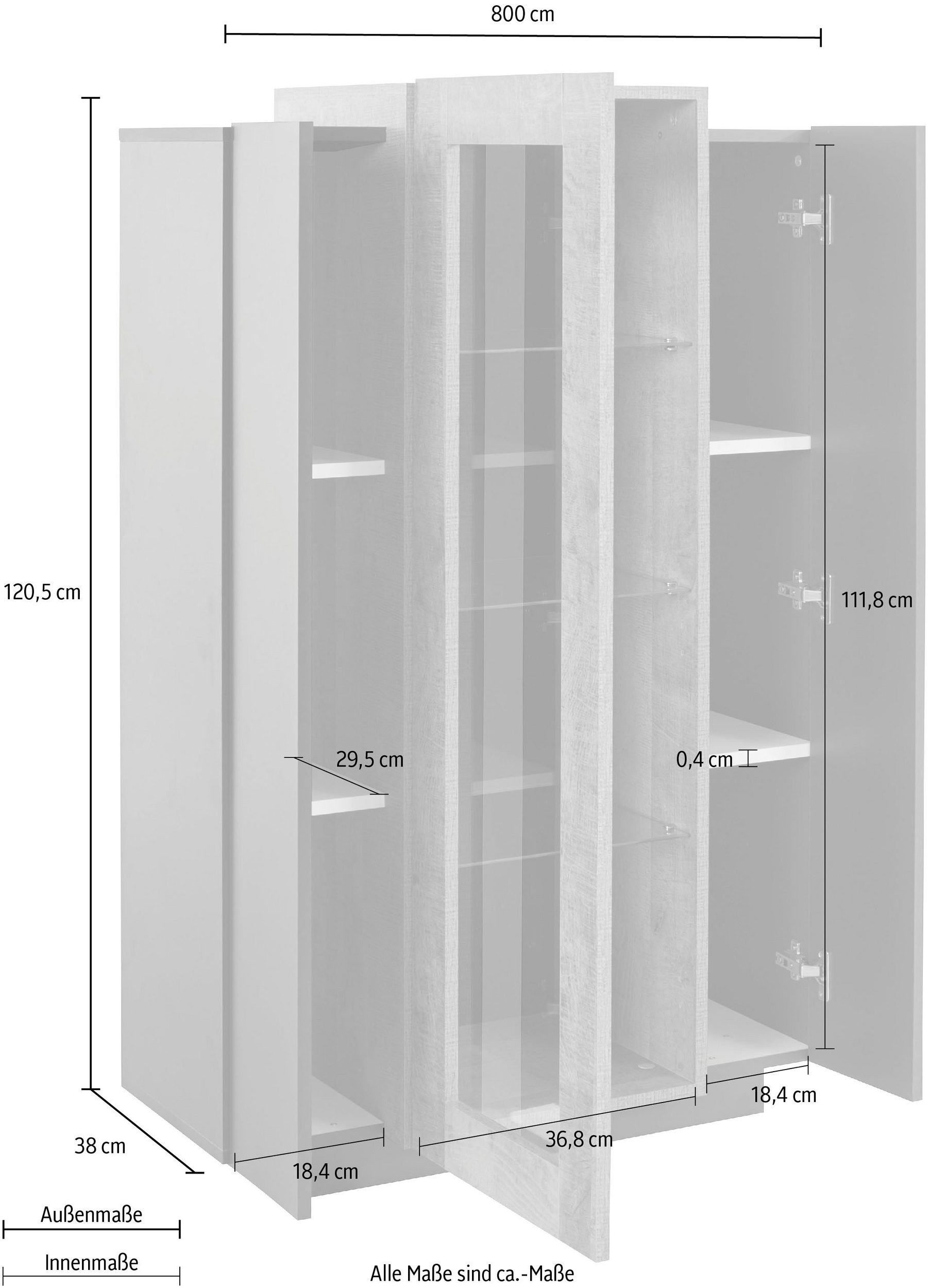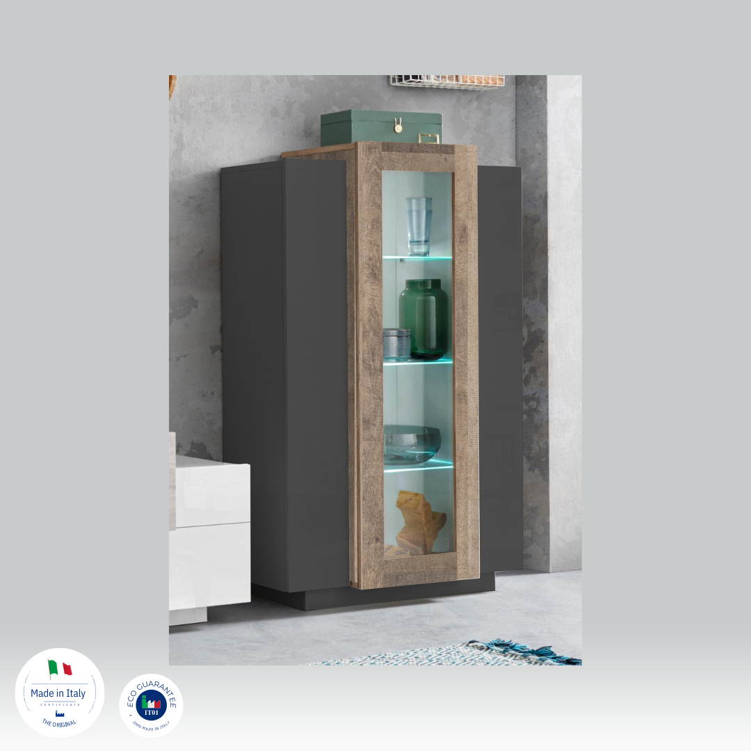 La vetrina CORO con 2 piccole ante laterali ed una grande anta a vetro risulta un mobile adatto ad un ambiente moderno, grazie al suo design lineare e pratico, può essere utilizzato sia singolarmente sia con altri componenti della collezione CORO.